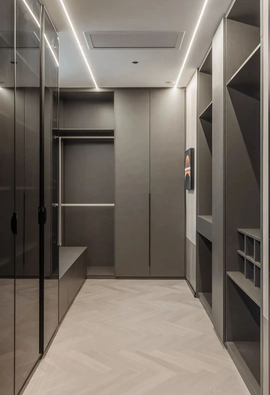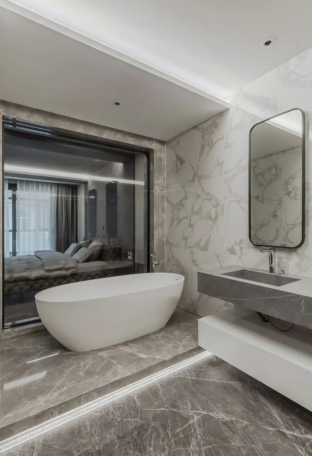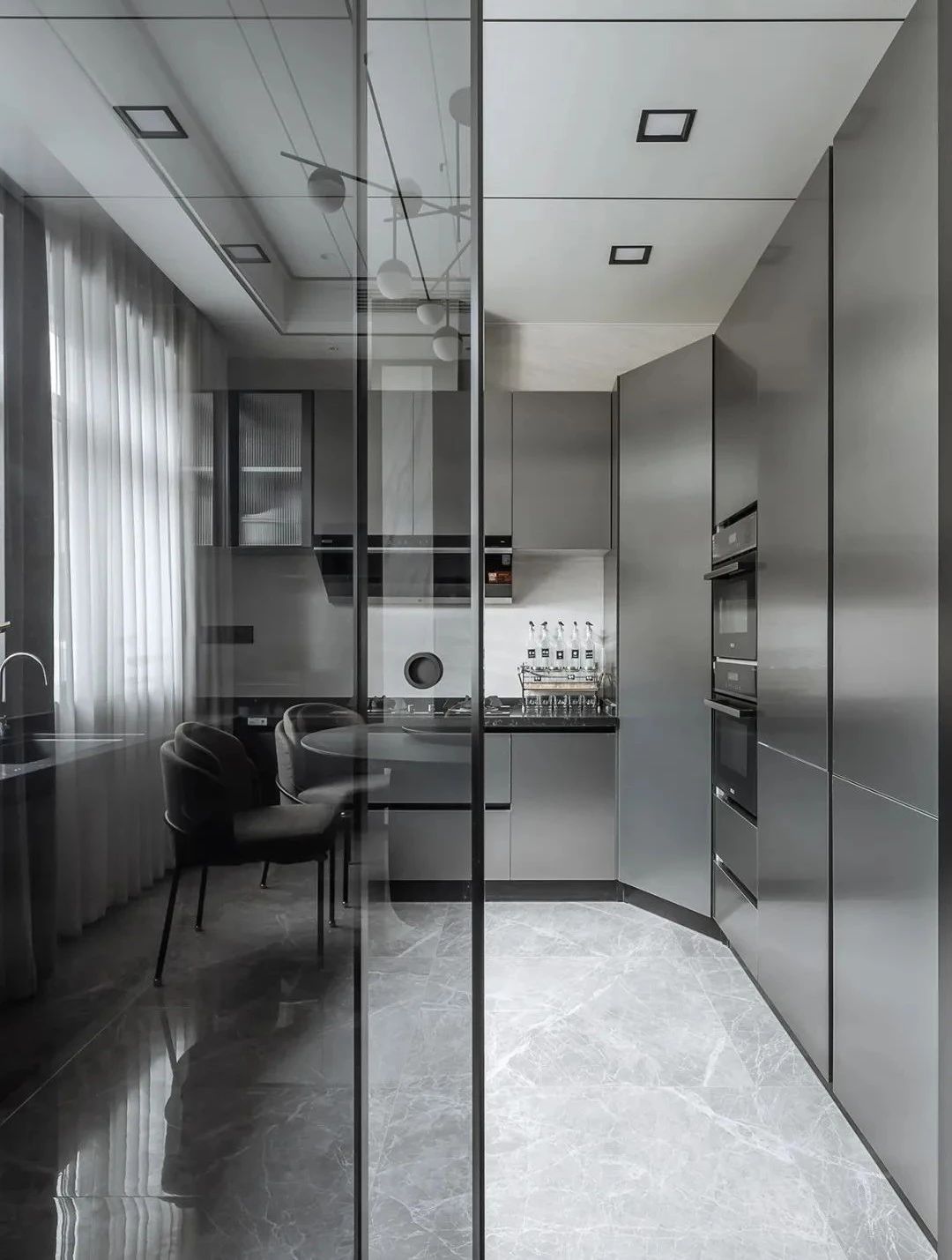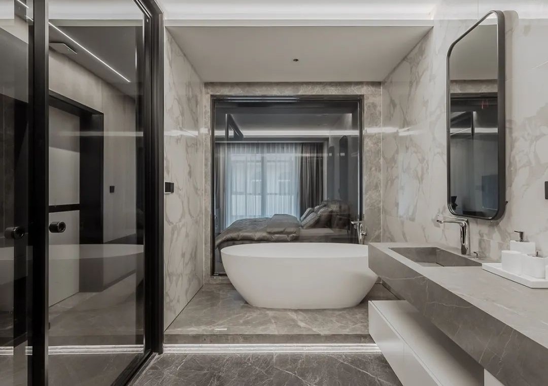空间中纯粹的艺术光感隐约营造出非凡品位和格调,构筑情感的依托,提升了空间气质的同时保证了生活功能需求,客餐厅中间开放式吧台延续了空间设计的开放性,构建出空间整体自由流畅动线,营造出自然的惬意,在远离都市喧嚣的宝地享受时间的节奏。
