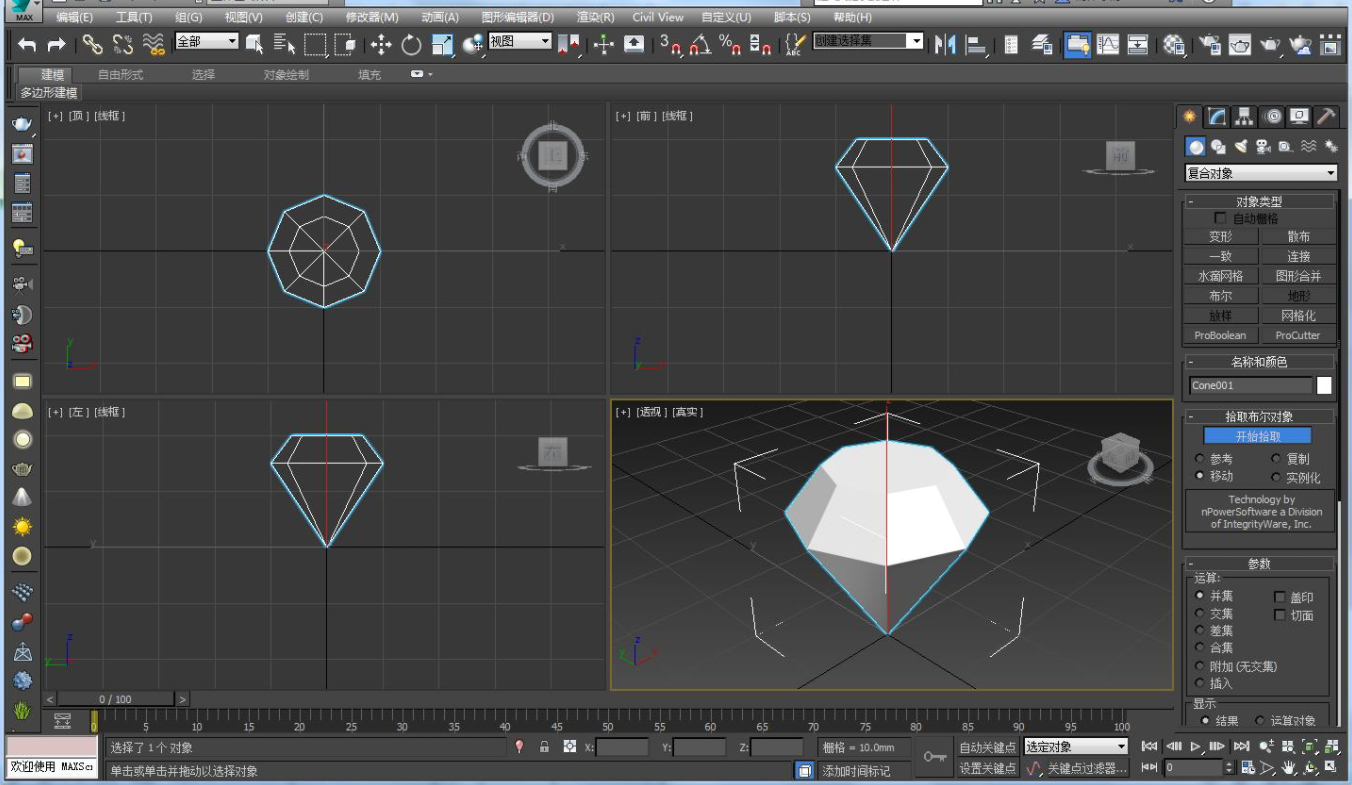 将两个造型物体进行Boolean合成以便形成一个新形状的物体。合成的方法有并集、差集、相交和合并四种,前三种相当于数学中的并、差、交运算。
