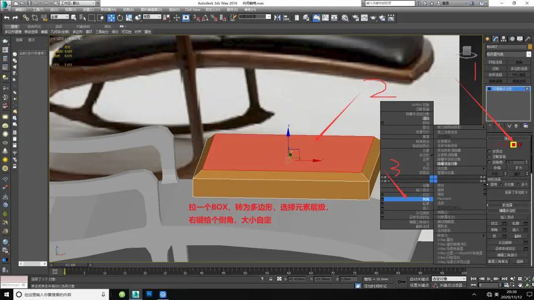 第十二步:创建一个长方体,转为“可编辑多边形”多边形层级选择顶面右键“倒角命令”地面也添加“倒角命令”;如图所示: