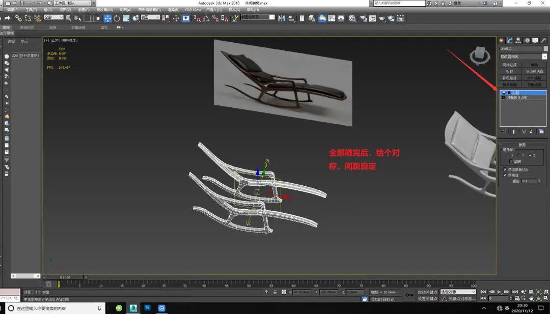 第八步:扶手大体做完添加“对称修改器”;如图所示: