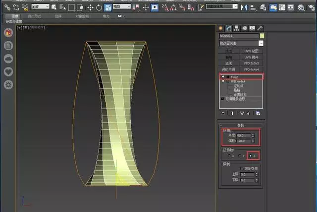 4、为模型添加一个扭曲命令,角度90,偏移-20,沿z轴方向;
