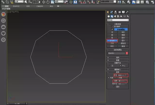 1、第一步,先在顶视图建一个多边形,半径50mm,边数10;