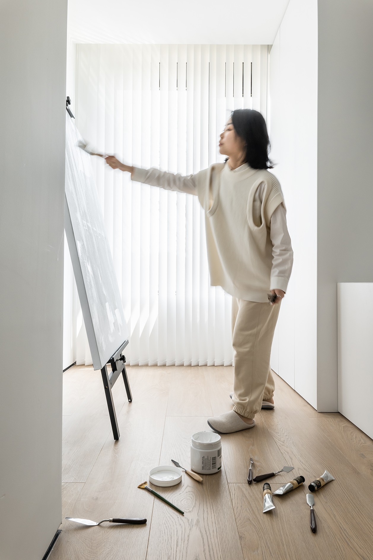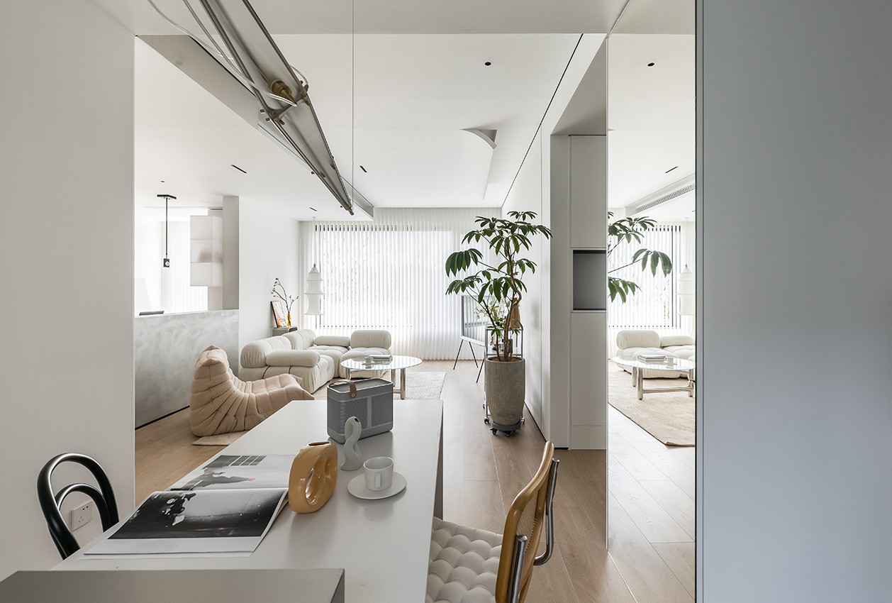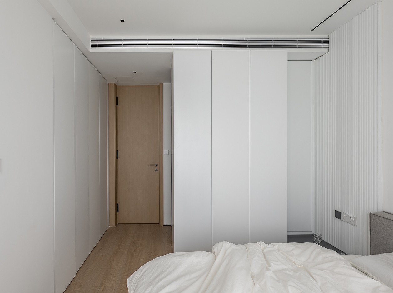 纯白的柜体与墙面融为一体,赋予空间纯粹地体验,在实用性与美感之间达到平衡。