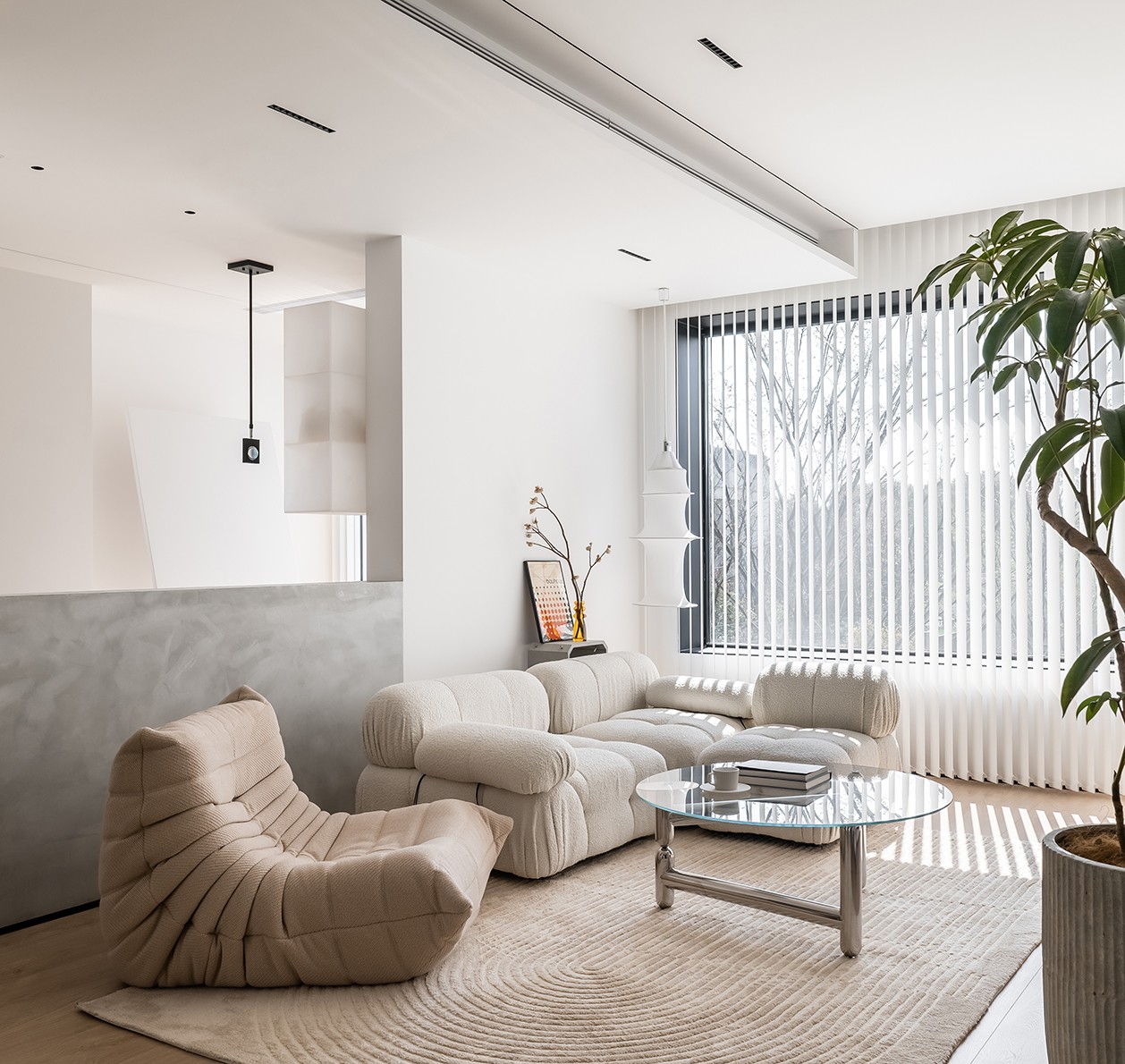 阳光透过竖向的百叶窗,霸道地占据整个空间,呈现出层次丰富的光影变化。躺在软萌的沙发上,感受难得的慵懒与自在。