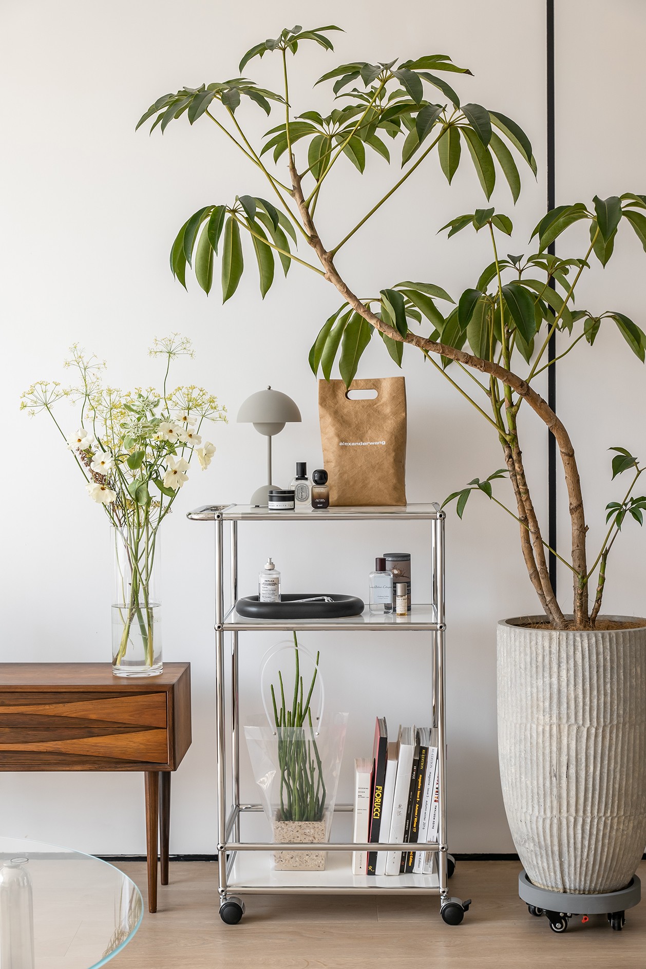 木色的中古柜带有历史沉淀感的却不显厚重,与包豪斯风格的小推车碰撞出趣味十足的冲突感,强化空间的张力。
