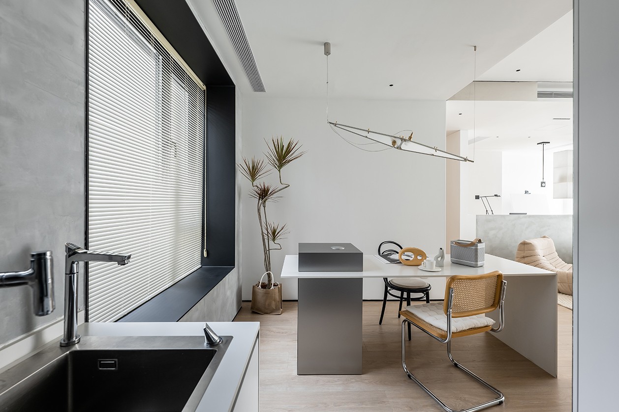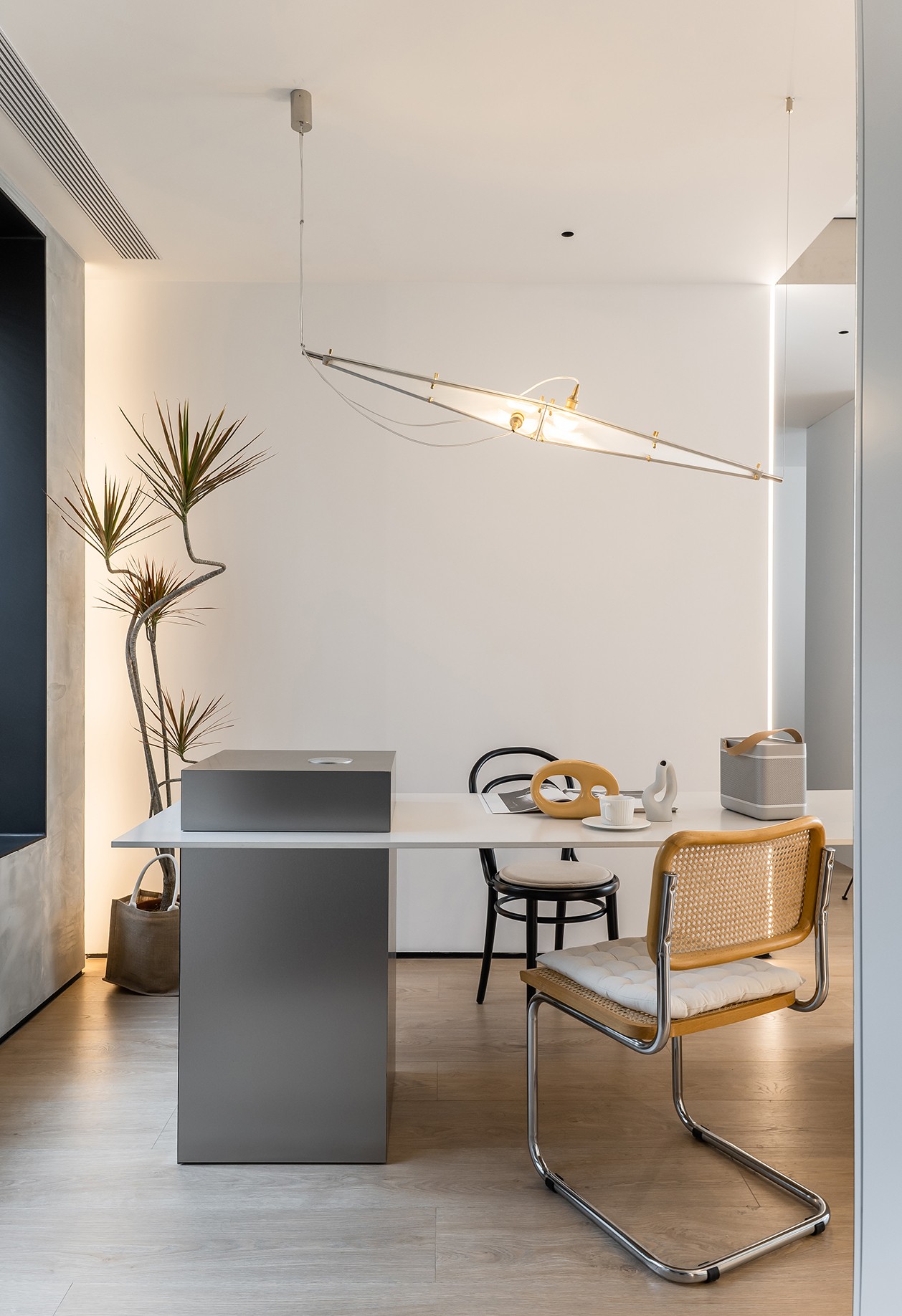 极简却颇具设计感的餐桌奠定了风格基础,灰白的体块相互穿插,灵动且轻盈。搭配不对称的中古椅,是艺术感与烟火气的融合。