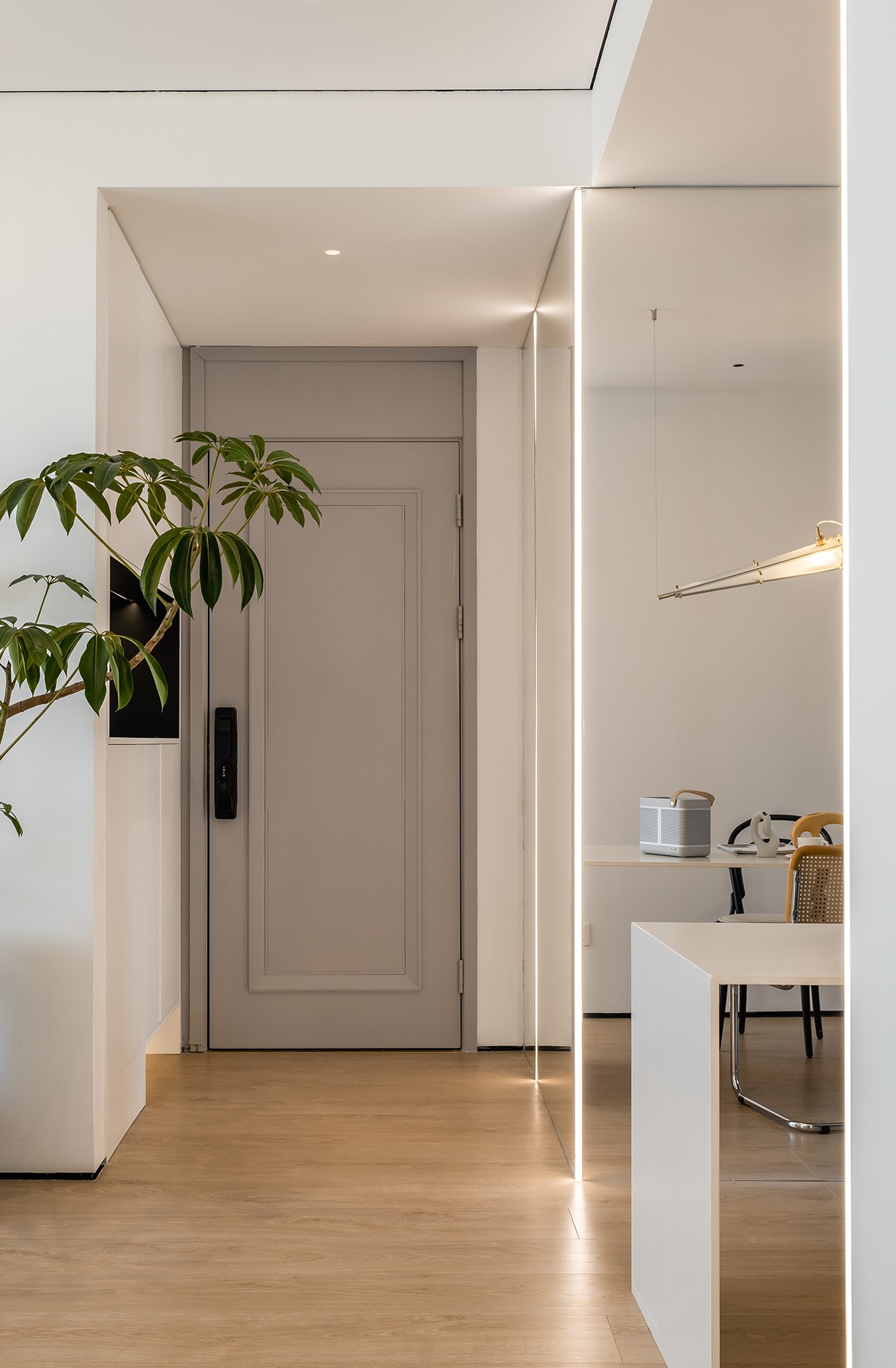 入户门特别选用了浅灰色,达到亮眼却不突兀的平衡感。左边藏露比适中的嵌入式柜体保证玄关区的整洁。右边线性光勾勒出的整面落地镜,将空间无限延展。
