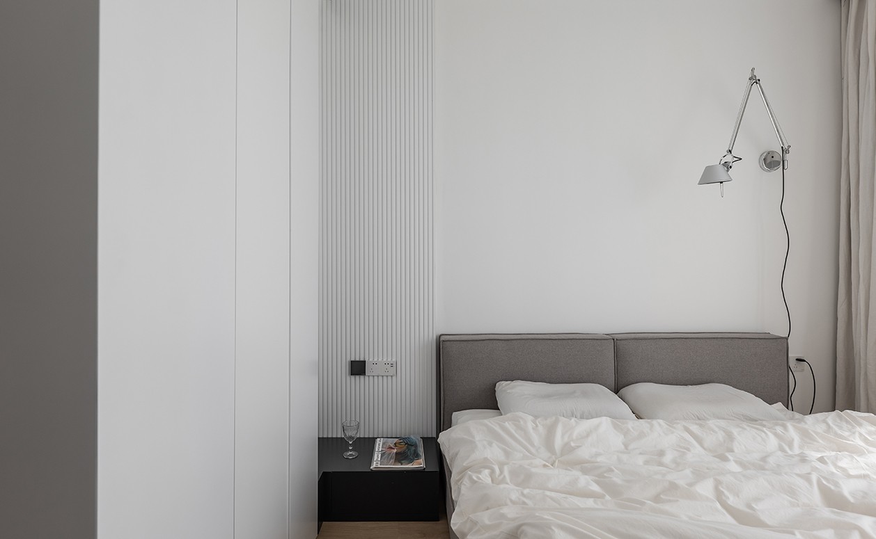 主卧以灰白的简约格调与公区形成对比,使空间瞬间静下来,辅之以柔软而放松的家具,将舒适度做到极致。
