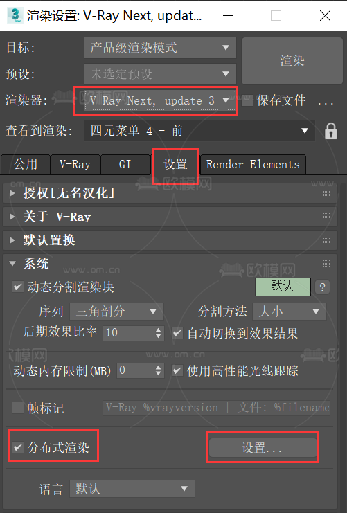 (1)首先打开渲染设置,设置渲染器为VRay渲染器,点击设置页面,勾选分布式渲染,再点击分布式渲染设置。