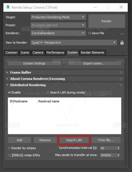 (3)在主PC上:在3ds Max中,转到“渲染设置”>“系统”>“分布式渲染”,勾选“启用”复选框,然后按“搜索局域网”。