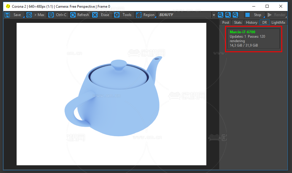 (7)在主PC上:您可以在Corona VFB的“DR”选项卡中看到“分布式渲染”信息