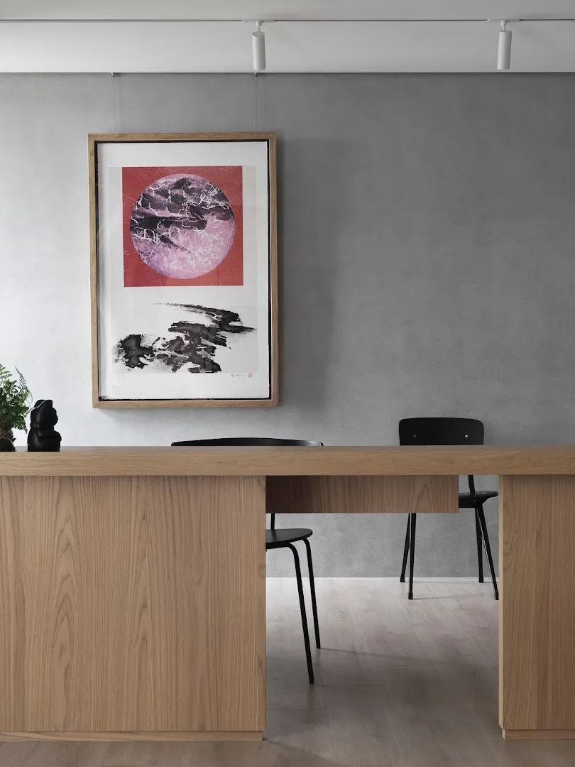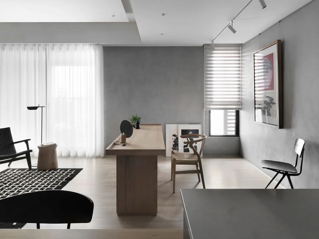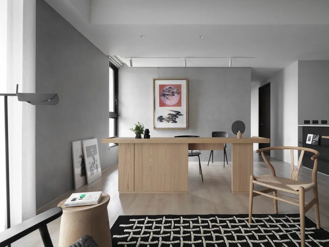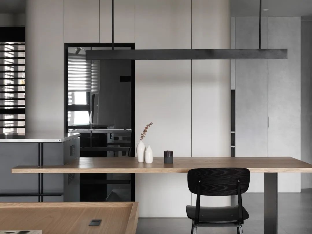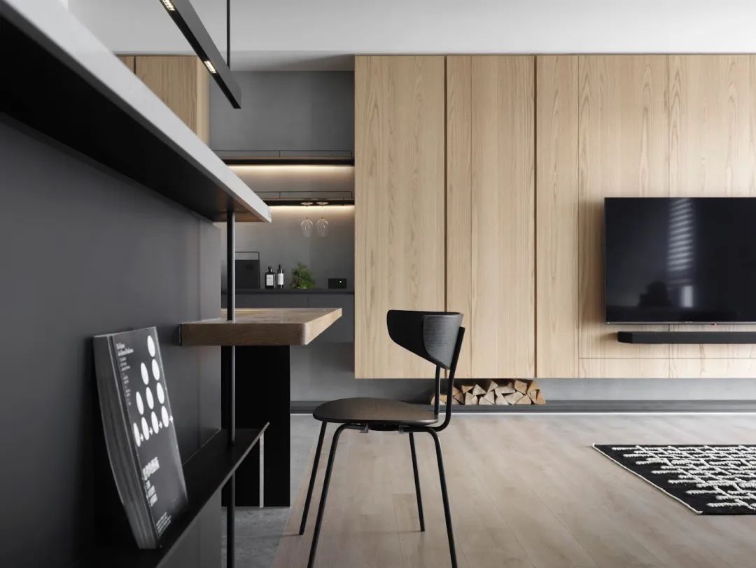 餐厅中岛的固定桌连接层分为两个区域,但不同的功能也共享连接。进入客厅区域后,面对大面积的西向采光,空间材料转化为大面积的天然木纹。并且通过客厅、办公桌、餐桌的连接,营造出简约温馨的家居氛围。