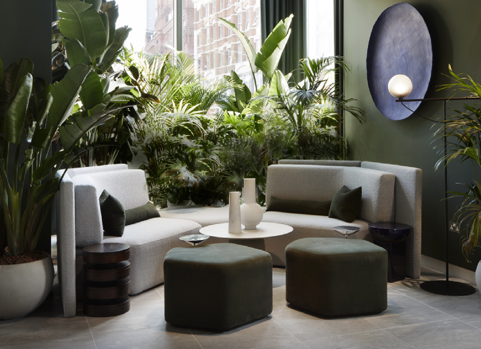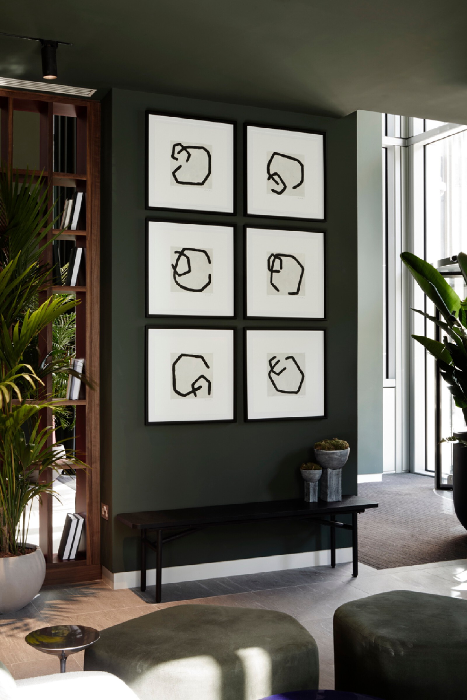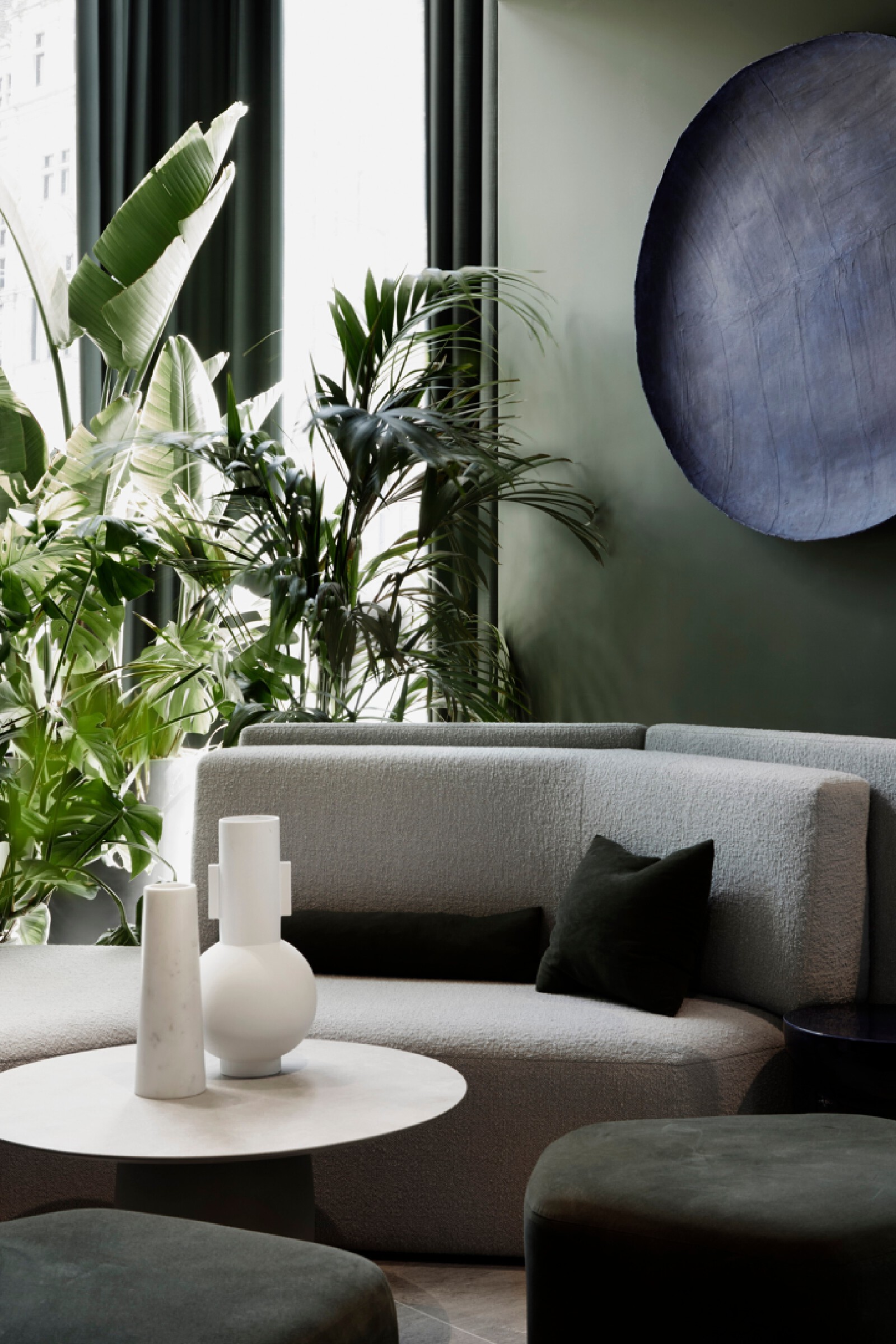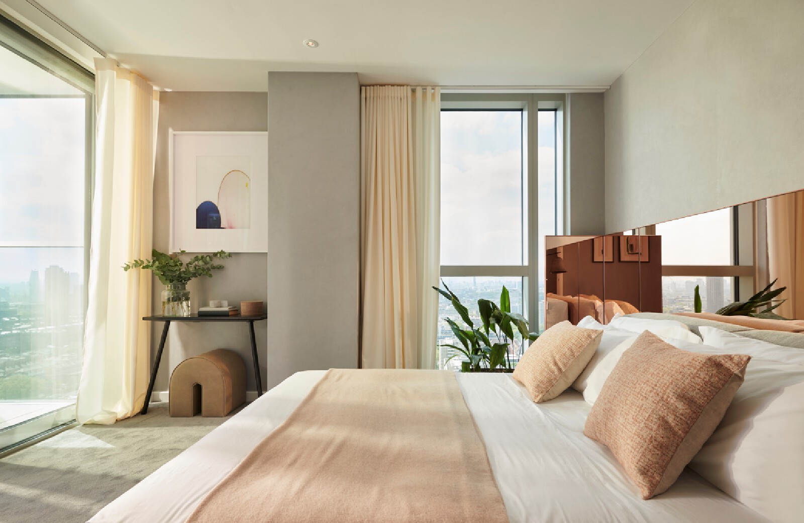 The Atlas building is the tallest residential tower in the City and has some of the best views in London. The show flat with its triple aspect is constantly changing based on weather and time of day providing a breathtaking sense of space that is unique to living at height. We wanted to inject elements which enhance and highlight the experience. We introduced large, tinted mirror surfaces which reflect and capture both the sky and urban views drawing them into the internal space. We naturally wanted to anchor the property in its locality and reflect the creative neighbourhood energy by combining interesting original artworks from up and coming artists with furniture pieces approached as crafted sculptural objects. Amenities, in the form of the lobby and resident lounge, provided an opportunity to create great social spaces with generous proportions and an urban feeling that comes with the postcode, while also ensuring that the environment is warm, relaxed and inviting. We used dark olive tones for the walls, ceiling and double height curtains while framing the seating clusters with lush foliage emanating indoor gardens.