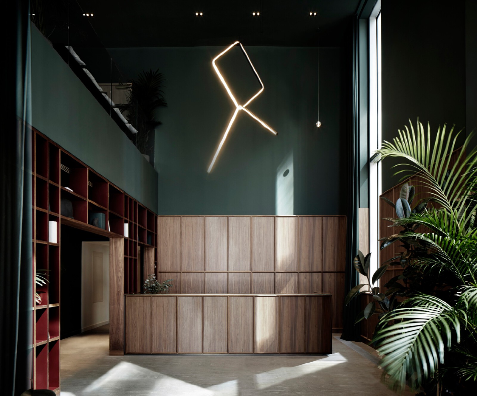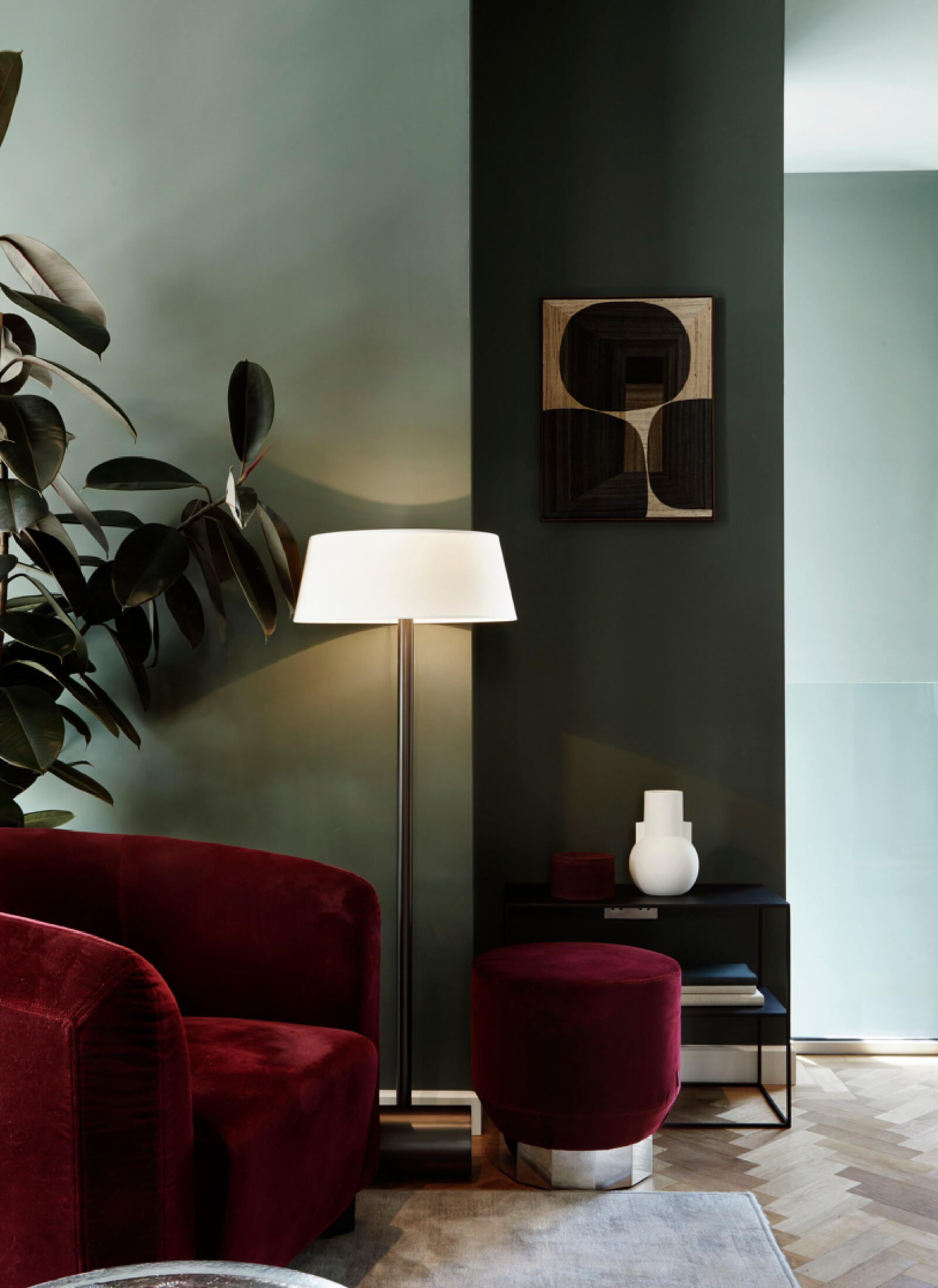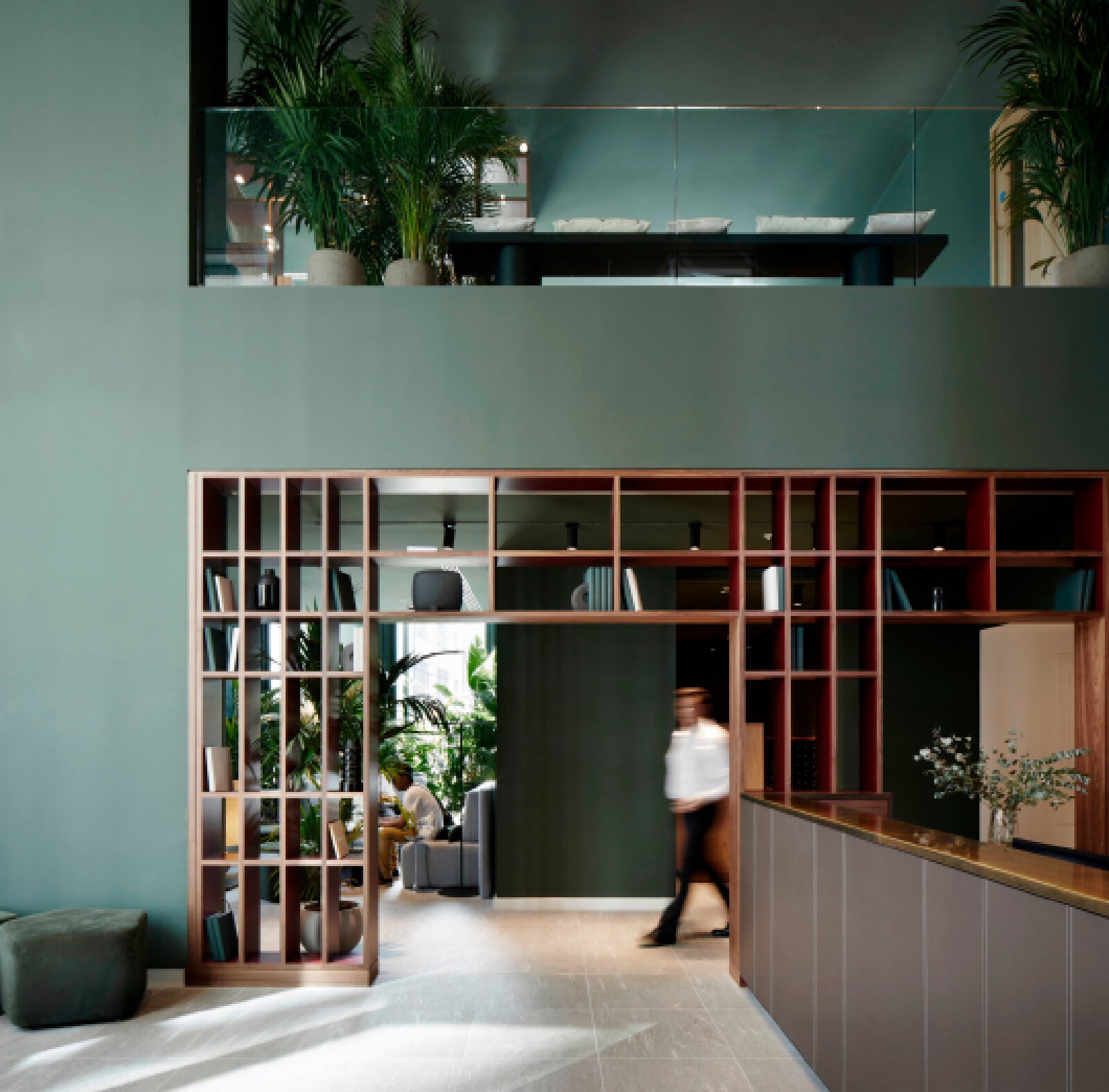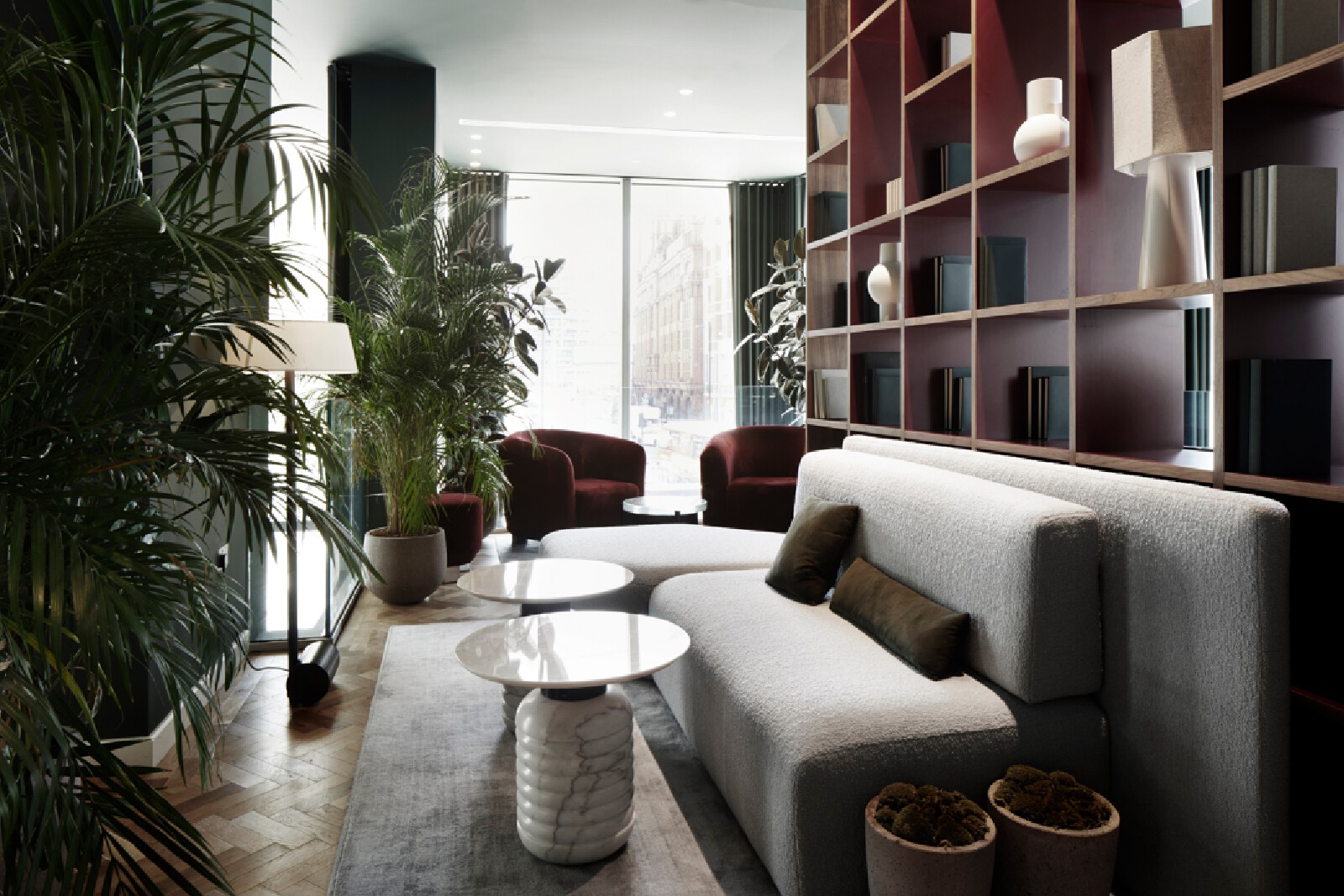 The Atlas building is the tallest residential tower in the City and has some of the best views in London. The show flat with its triple aspect is constantly changing based on weather and time of day providing a breathtaking sense of space that is unique to living at height. We wanted to inject elements which enhance and highlight the experience. We introduced large, tinted mirror surfaces which reflect and capture both the sky and urban views drawing them into the internal space. We naturally wanted to anchor the property in its locality and reflect the creative neighbourhood energy by combining interesting original artworks from up and coming artists with furniture pieces approached as crafted sculptural objects. Amenities, in the form of the lobby and resident lounge, provided an opportunity to create great social spaces with generous proportions and an urban feeling that comes with the postcode, while also ensuring that the environment is warm, relaxed and inviting. We used dark olive tones for the walls, ceiling and double height curtains while framing the seating clusters with lush foliage emanating indoor gardens.