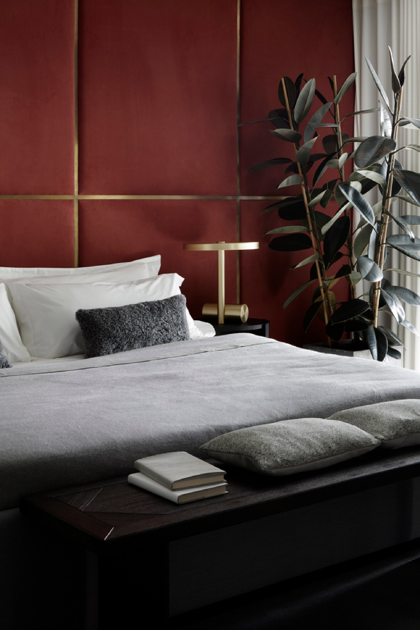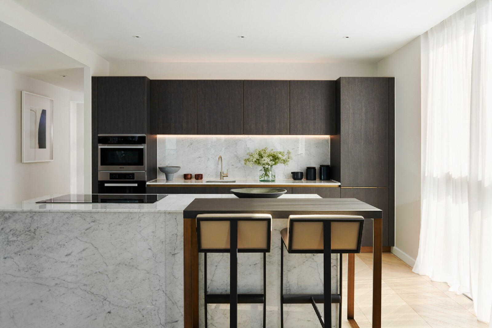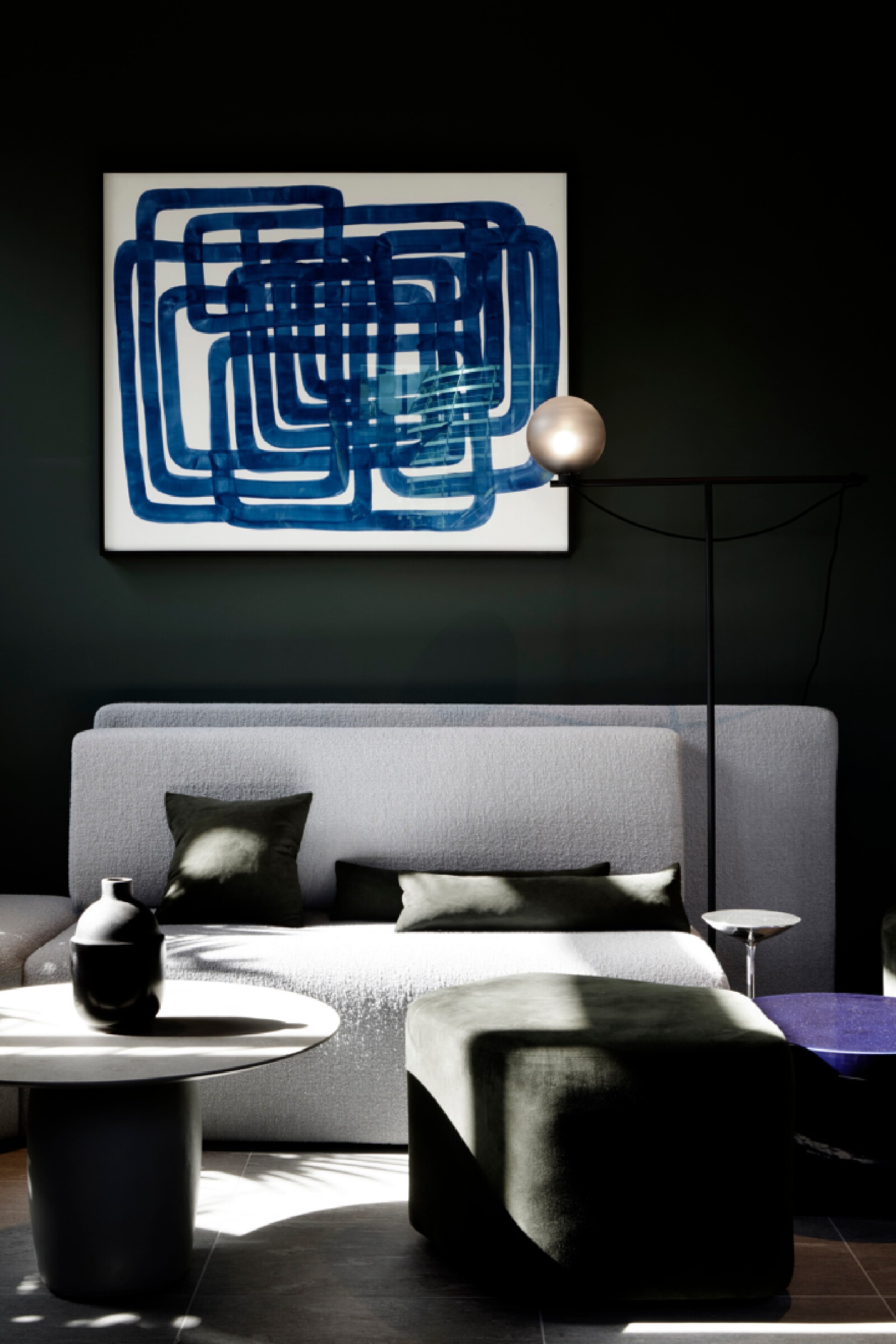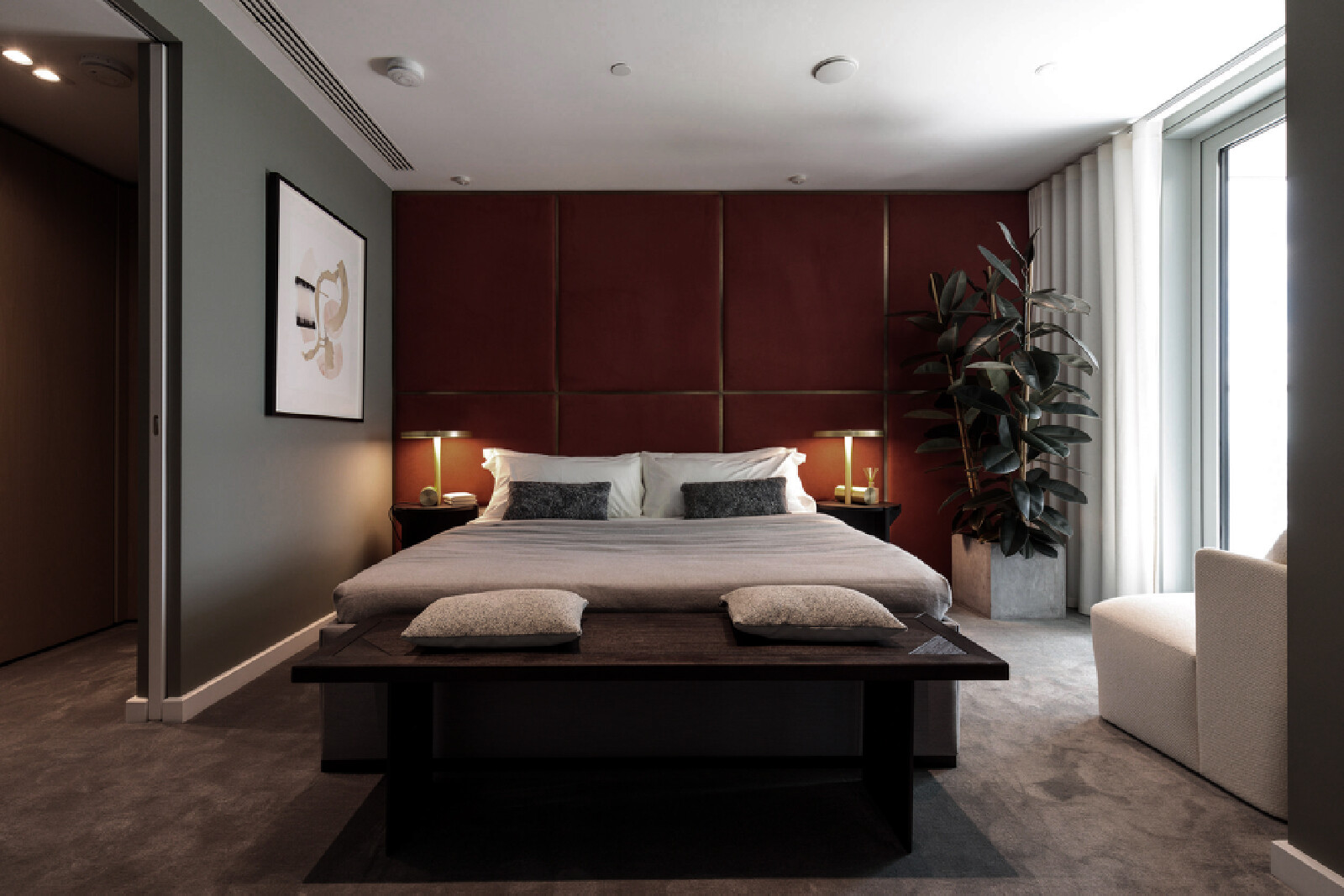 The Atlas building is the tallest residential tower in the City and has some of the best views in London. The show flat with its triple aspect is constantly changing based on weather and time of day providing a breathtaking sense of space that is unique to living at height. We wanted to inject elements which enhance and highlight the experience. We introduced large, tinted mirror surfaces which reflect and capture both the sky and urban views drawing them into the internal space. We naturally wanted to anchor the property in its locality and reflect the creative neighbourhood energy by combining interesting original artworks from up and coming artists with furniture pieces approached as crafted sculptural objects. Amenities, in the form of the lobby and resident lounge, provided an opportunity to create great social spaces with generous proportions and an urban feeling that comes with the postcode, while also ensuring that the environment is warm, relaxed and inviting. We used dark olive tones for the walls, ceiling and double height curtains while framing the seating clusters with lush foliage emanating indoor gardens.
