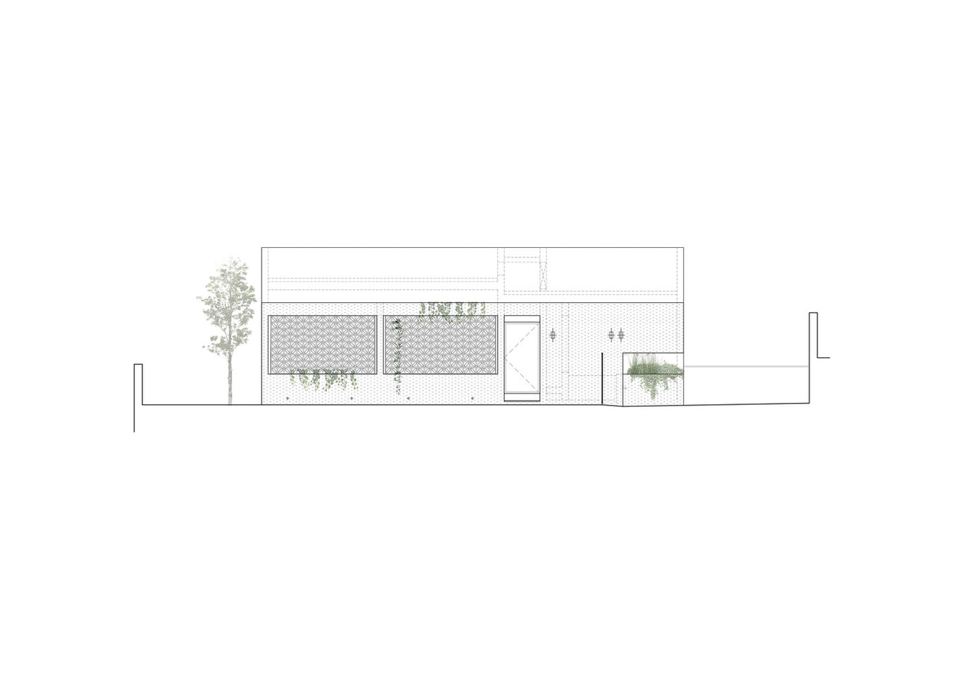 房子的几何形状干净简单,保持了白色盒子的直线。但在盒子里有独特的形状、材料和诠释,使盒子为居住者和游客提供不断发展的体验:从炎热的南街道进入前面的绿色花园是航行的第一步。从前面的花园,接下来的体验是进入一个封闭的有阴影的户外门厅,装饰着藤蔓和人造花盆。