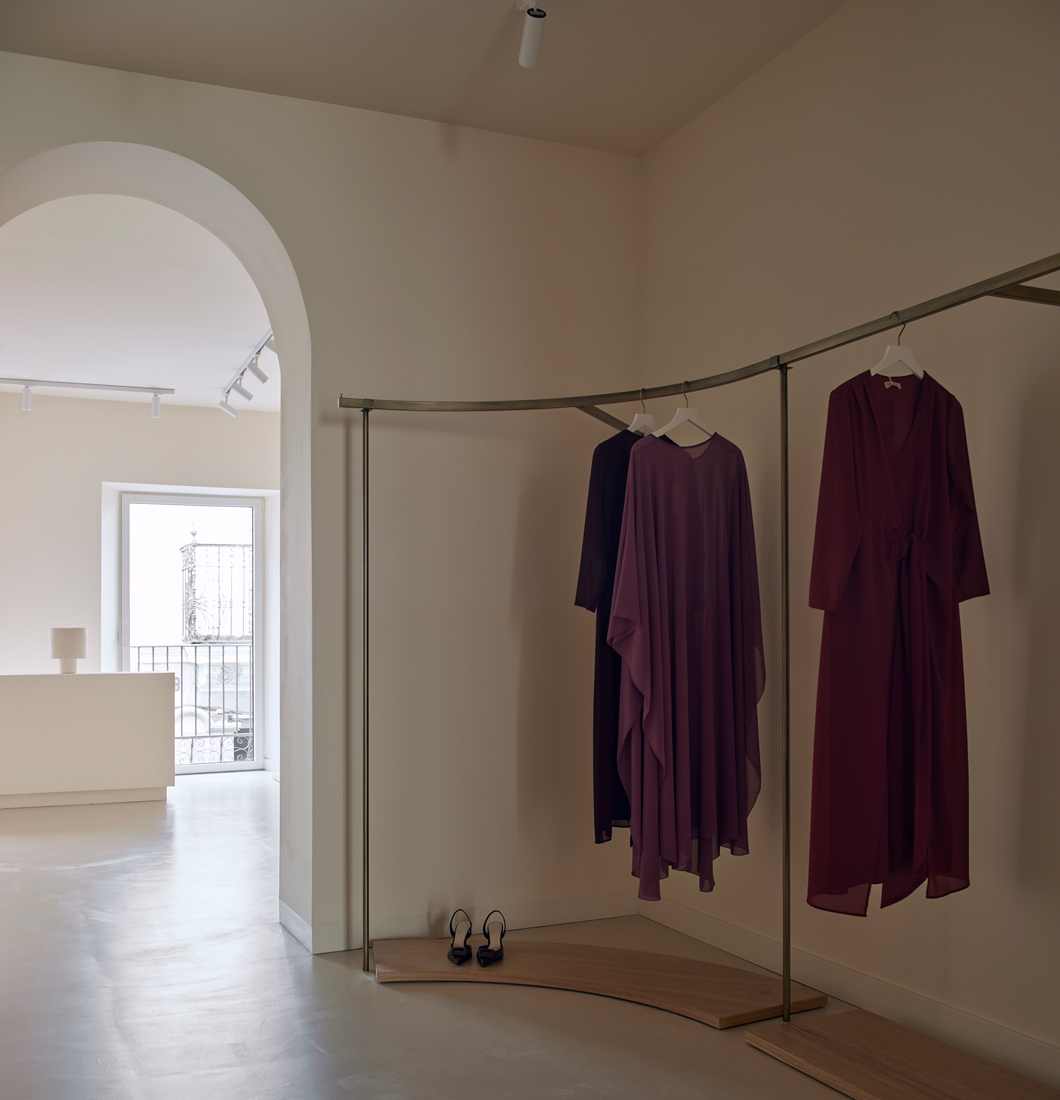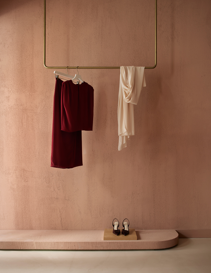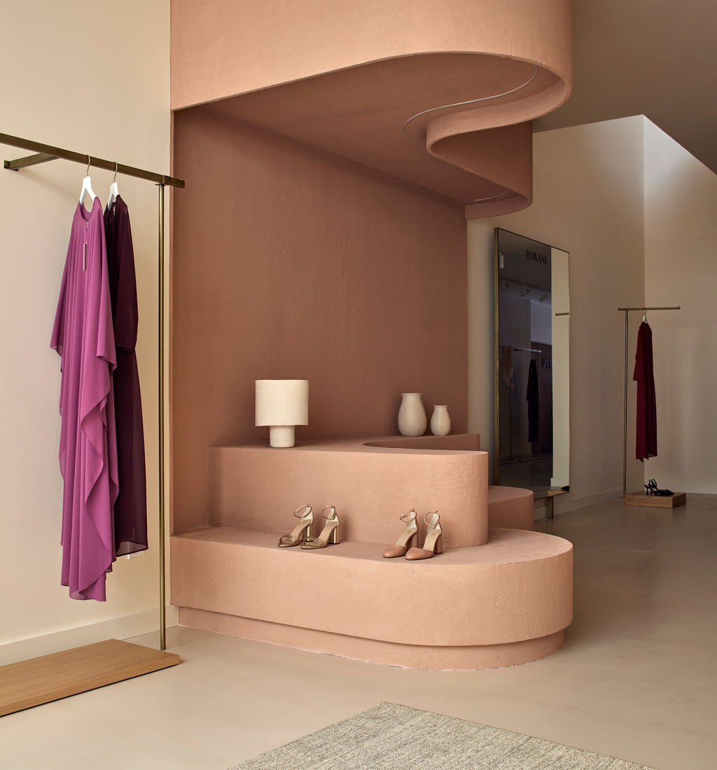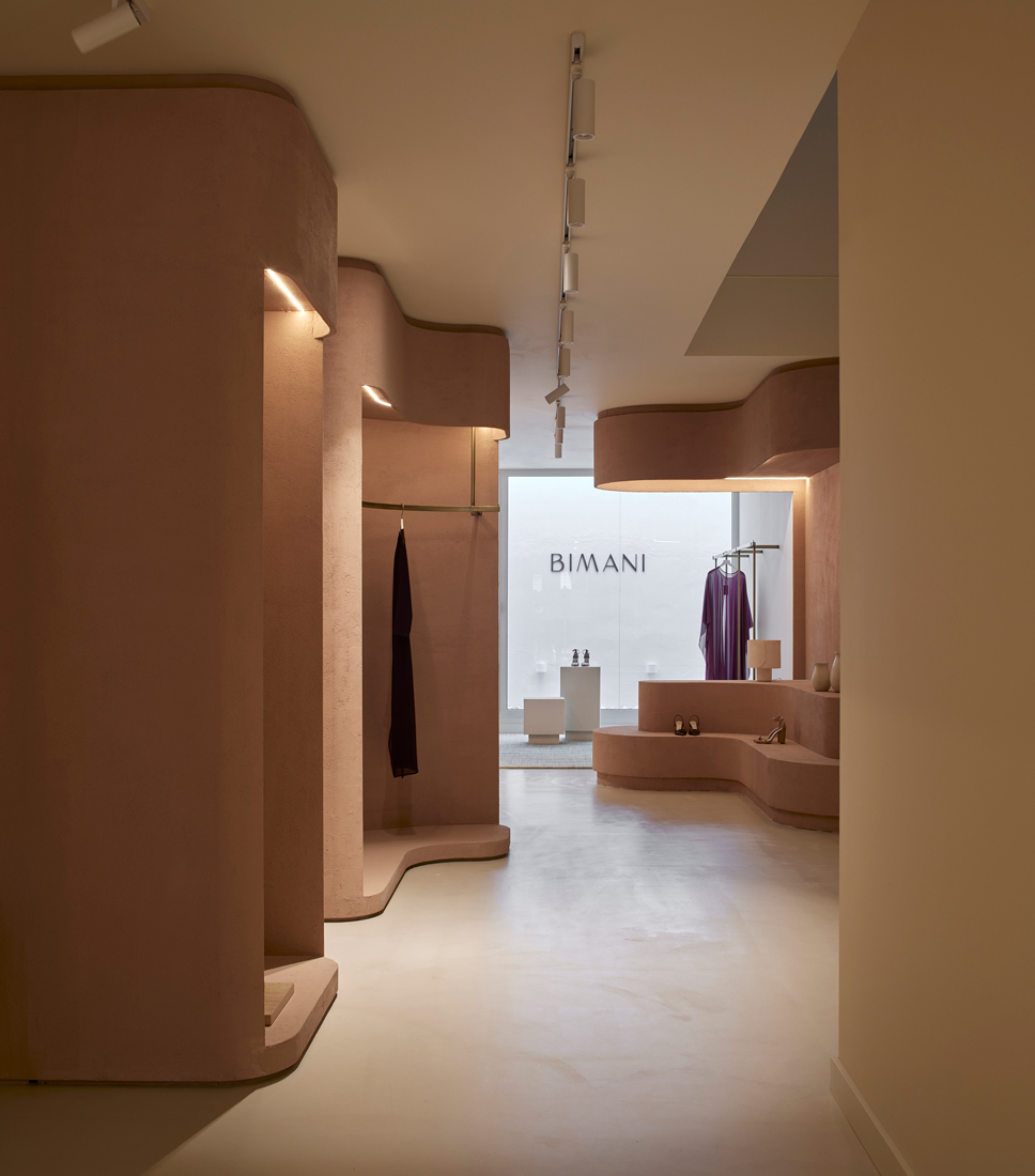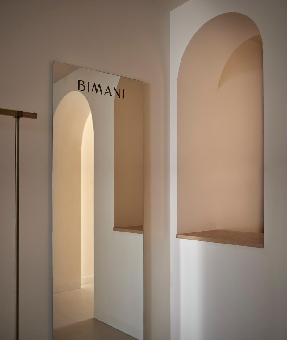 此次,线性展览系统与不同体量的简洁曲线共存,创造出不同的胶囊,其中 Bimani 的服装和配饰脱颖而出,再次将女性置于被灯光、纹理和感觉包围的体验宇宙的中心。
