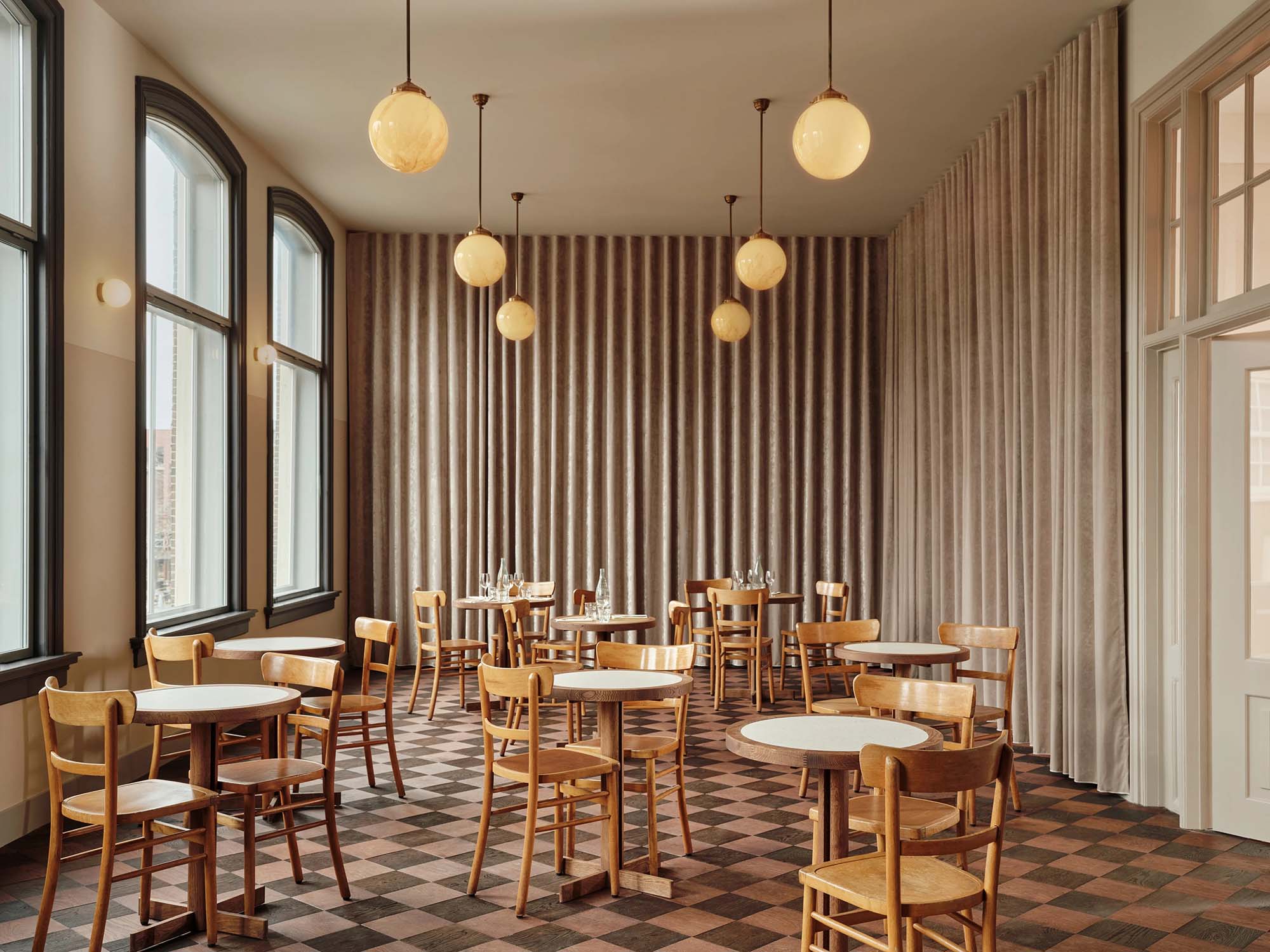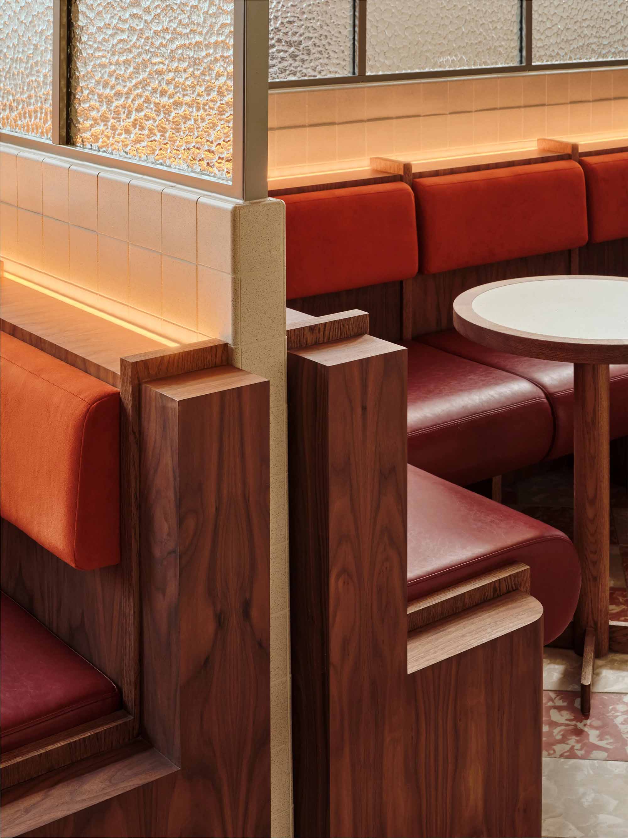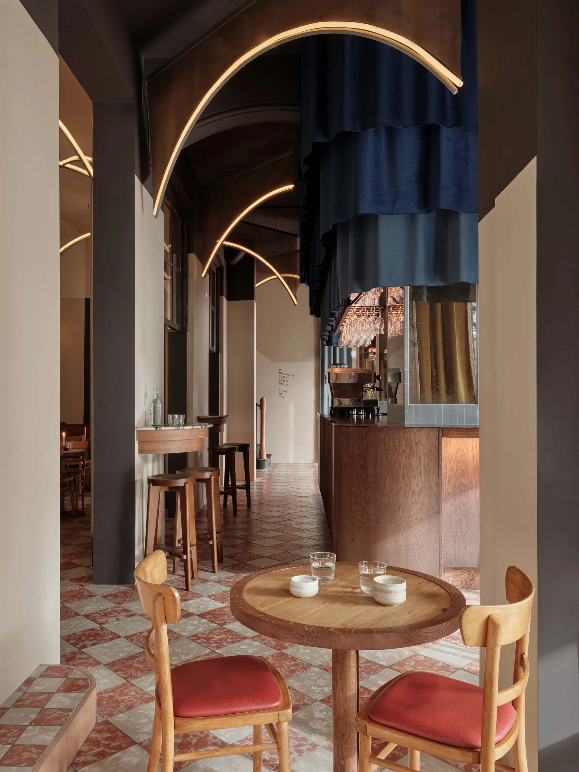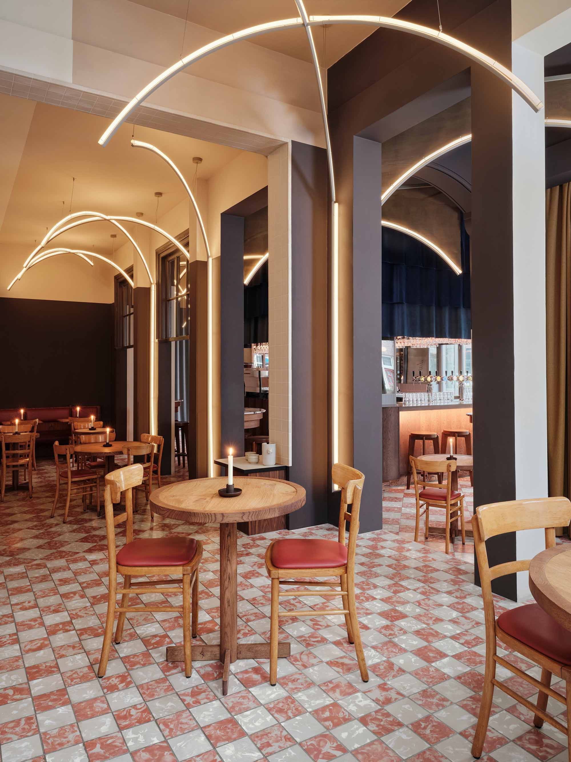 设计师巧妙地将空间方向调整为面向广场,让城市融入其中。主酒馆内部设有开放式厨房和朱红色的长凳,为食客提供观看食物制作的视角。同时,定制的灯具和家具设计灵感来源于建筑过去作为学校的时代,体现了对历史的尊重与传承。整个空间既有历史的厚重感,又不失现代与时尚的气息。