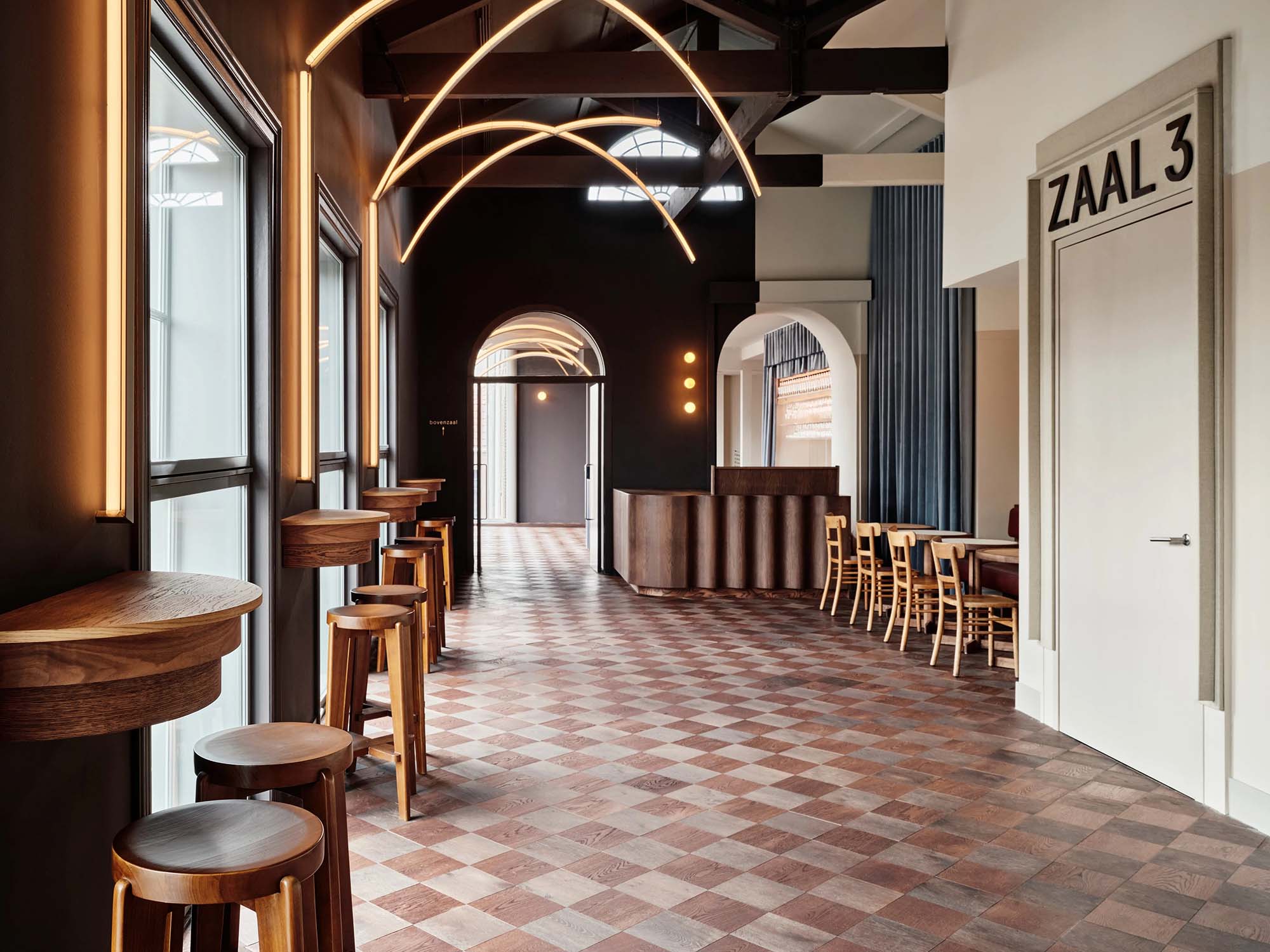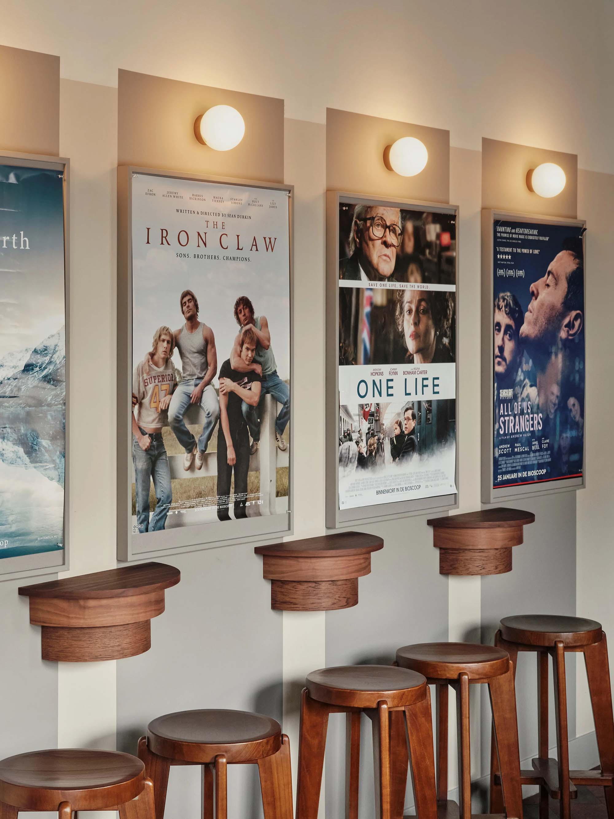 新的主入口通过 Lugten Malschaert 建筑事务所的设计,打破了旧立面,展示了原有窗户,并引入自然光。内部设计则营造了一种戏剧性的氛围,从浅蓝色的天鹅绒窗帘到巨大的电影海报墙,再到聚光灯点缀的售票处,无不体现出对电影艺术的敬意。