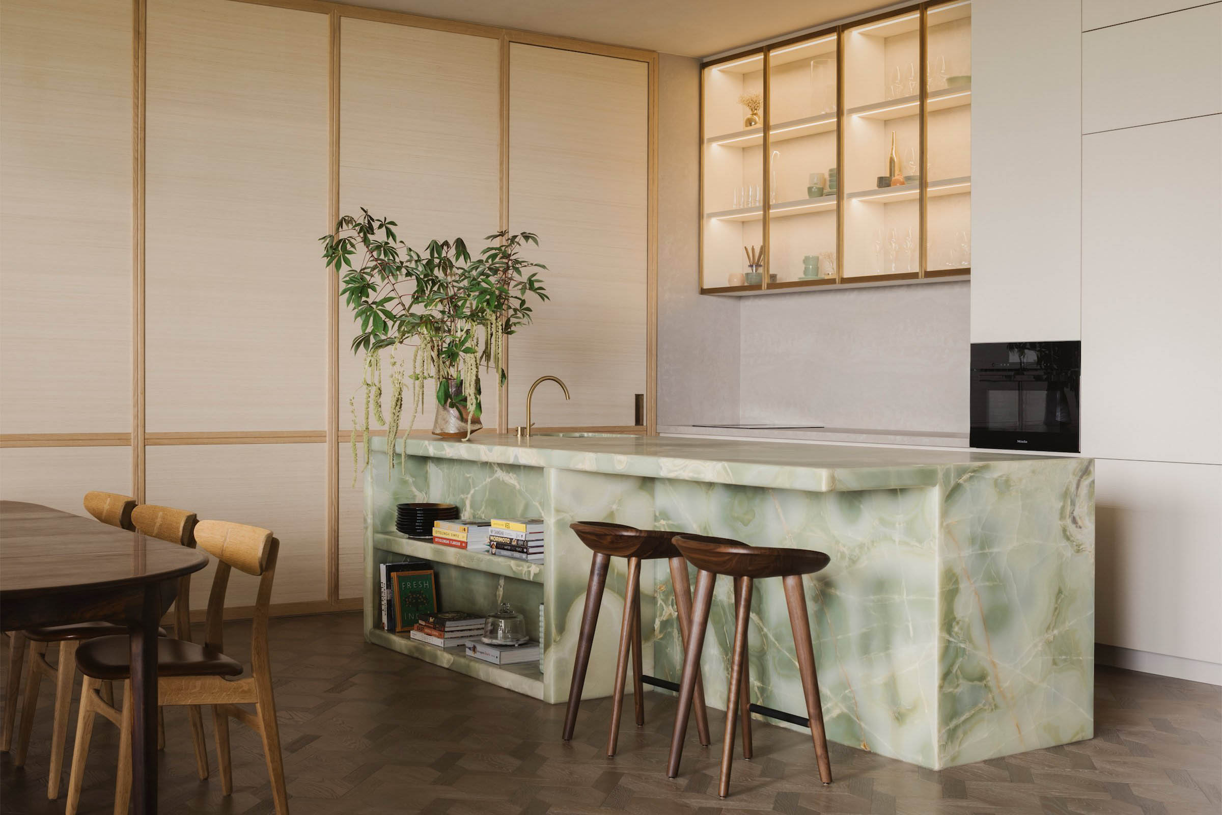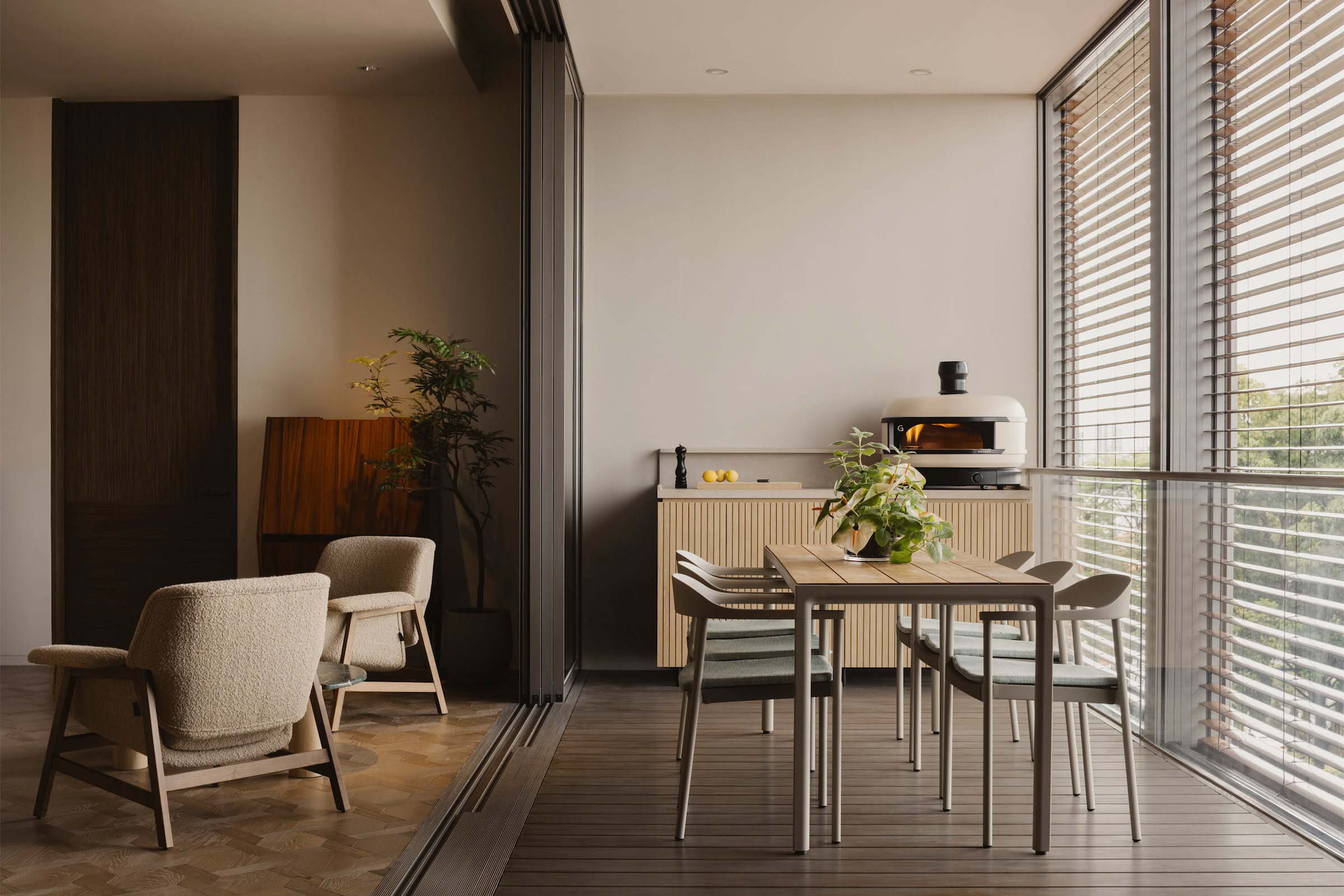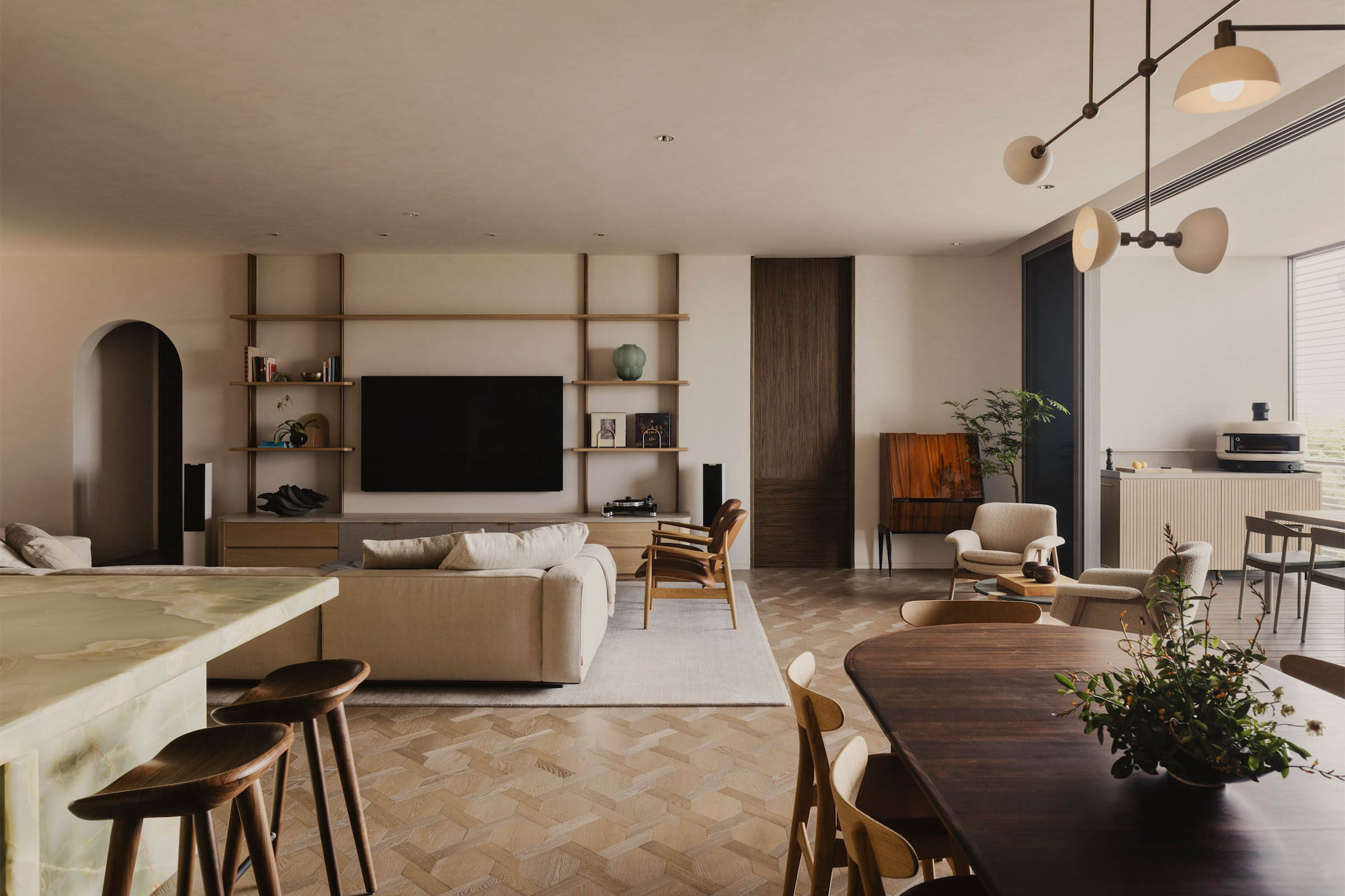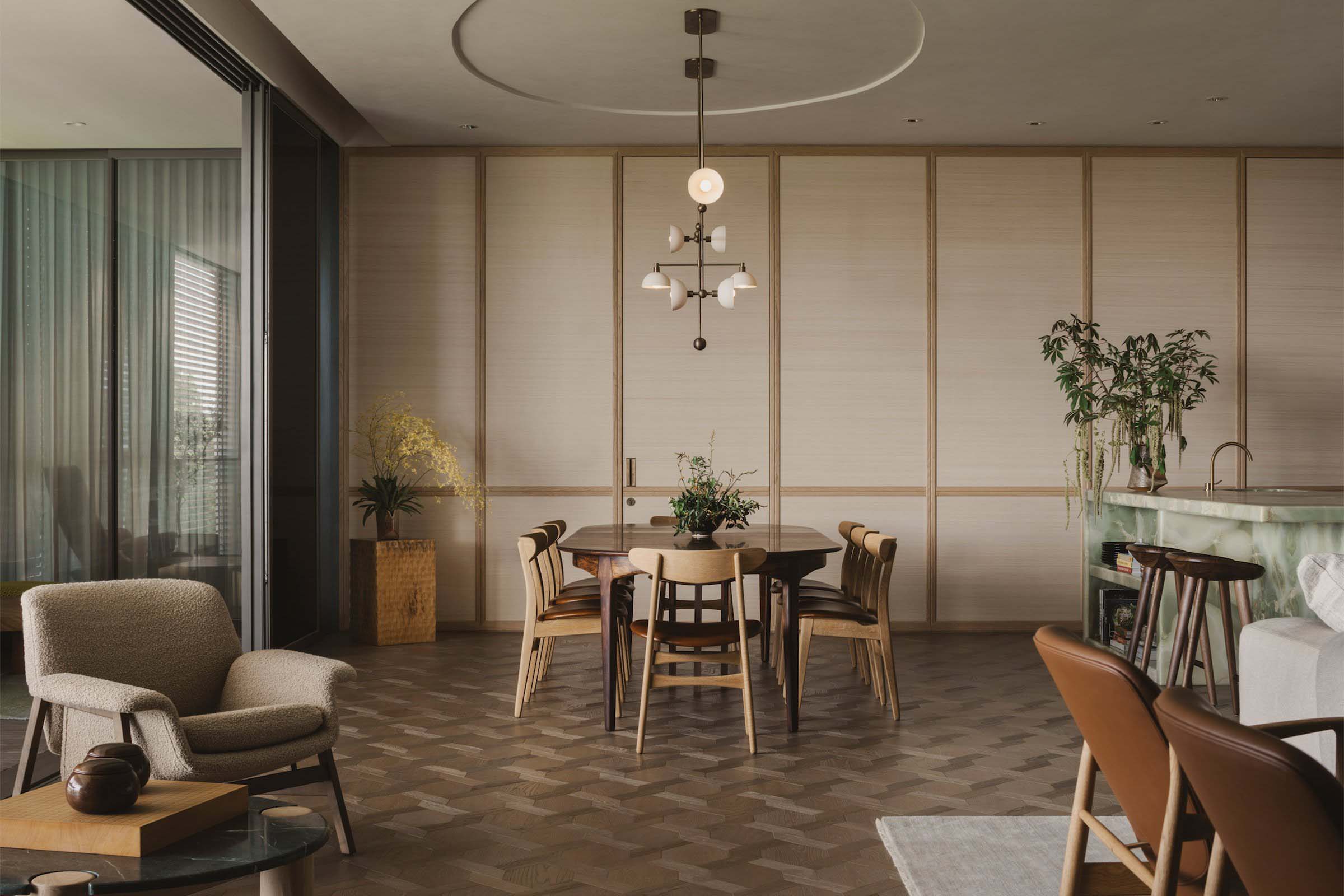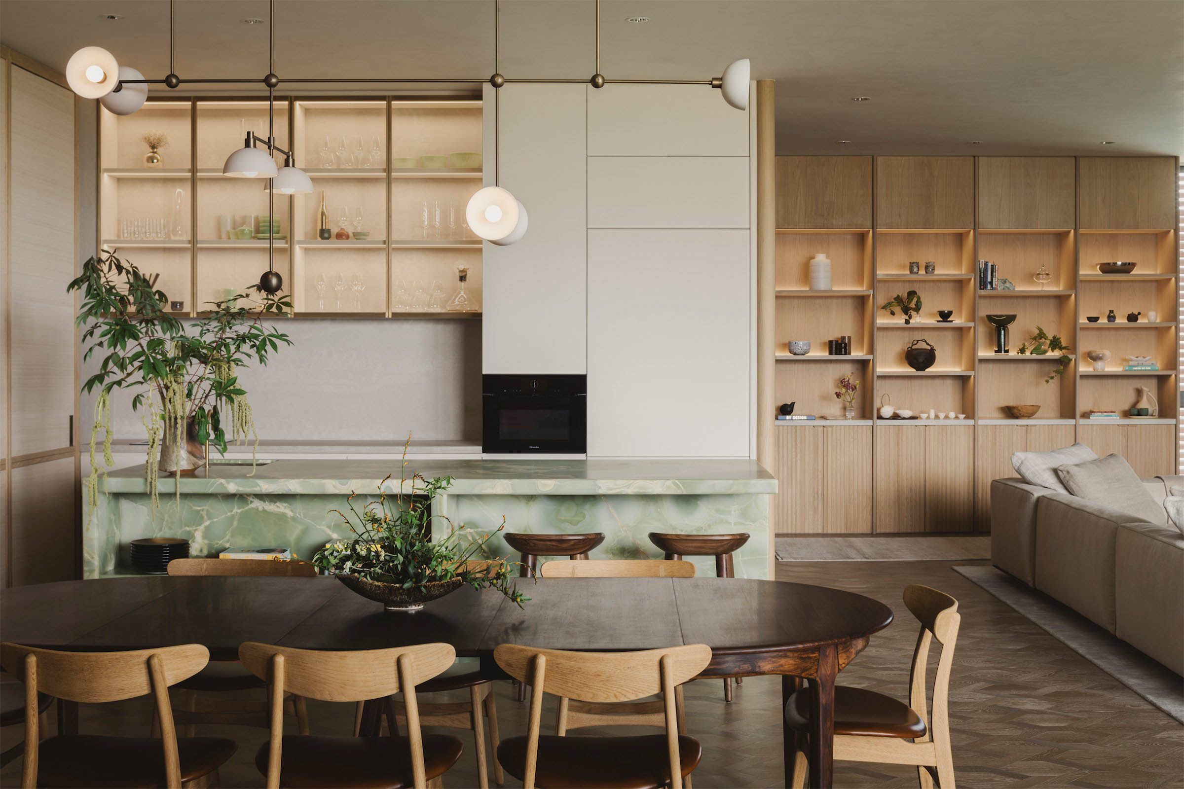 新加坡Takenouchi Webb工作室,由马克·韦伯(Marc Webb)与竹内直子(Naoko Takenouchi)夫妇共营,以精湛材料运用见长,本次案例为他们的家。两人钟情于各自爱好,马克爱潜水与制披萨,竹内则痴迷烹饪与音乐。其设计中,原始饰面与石灰石膏相映成趣,手工质感显著。拱形与曲线柔化硬边,定制金属架与扇形墙承袭此风。开放式起居用餐区巧妙分隔,家具陈设独具匠心。厨房延伸至起居区,绿色玛瑙柜台集休闲与专业于一体。阳台工作台专为披萨制作设计,配备齐全。品牌家具与灯饰增添家居轻松个性。