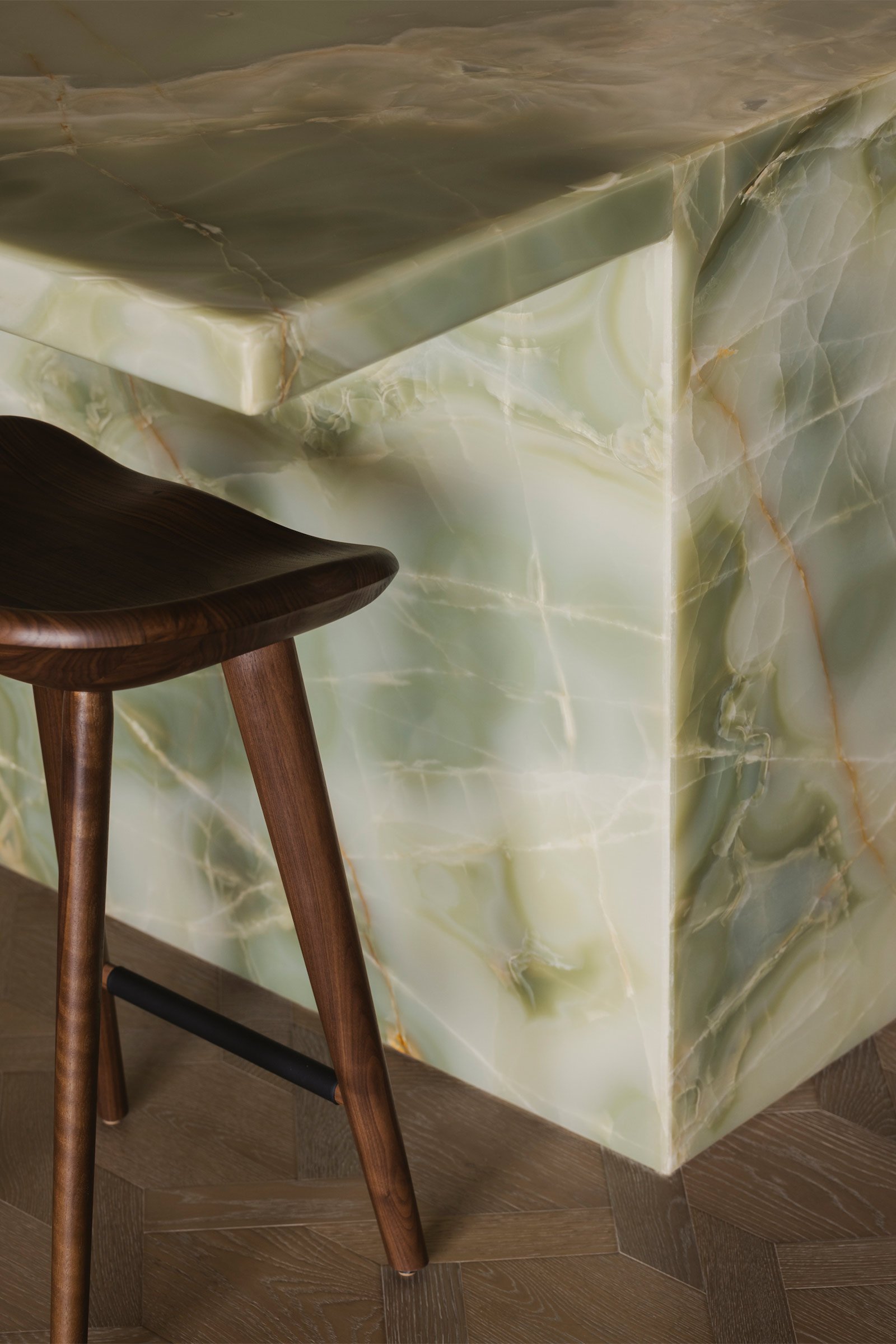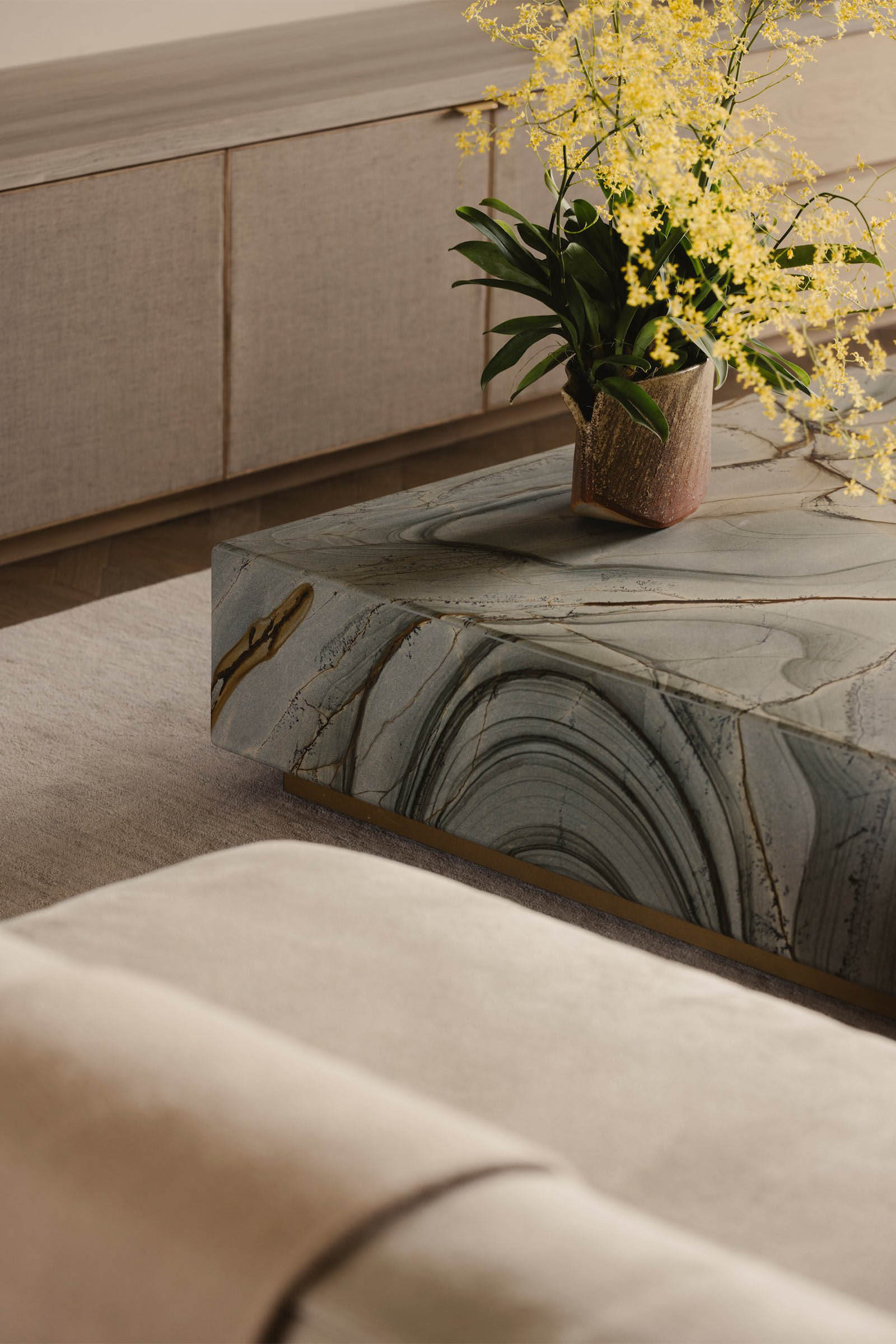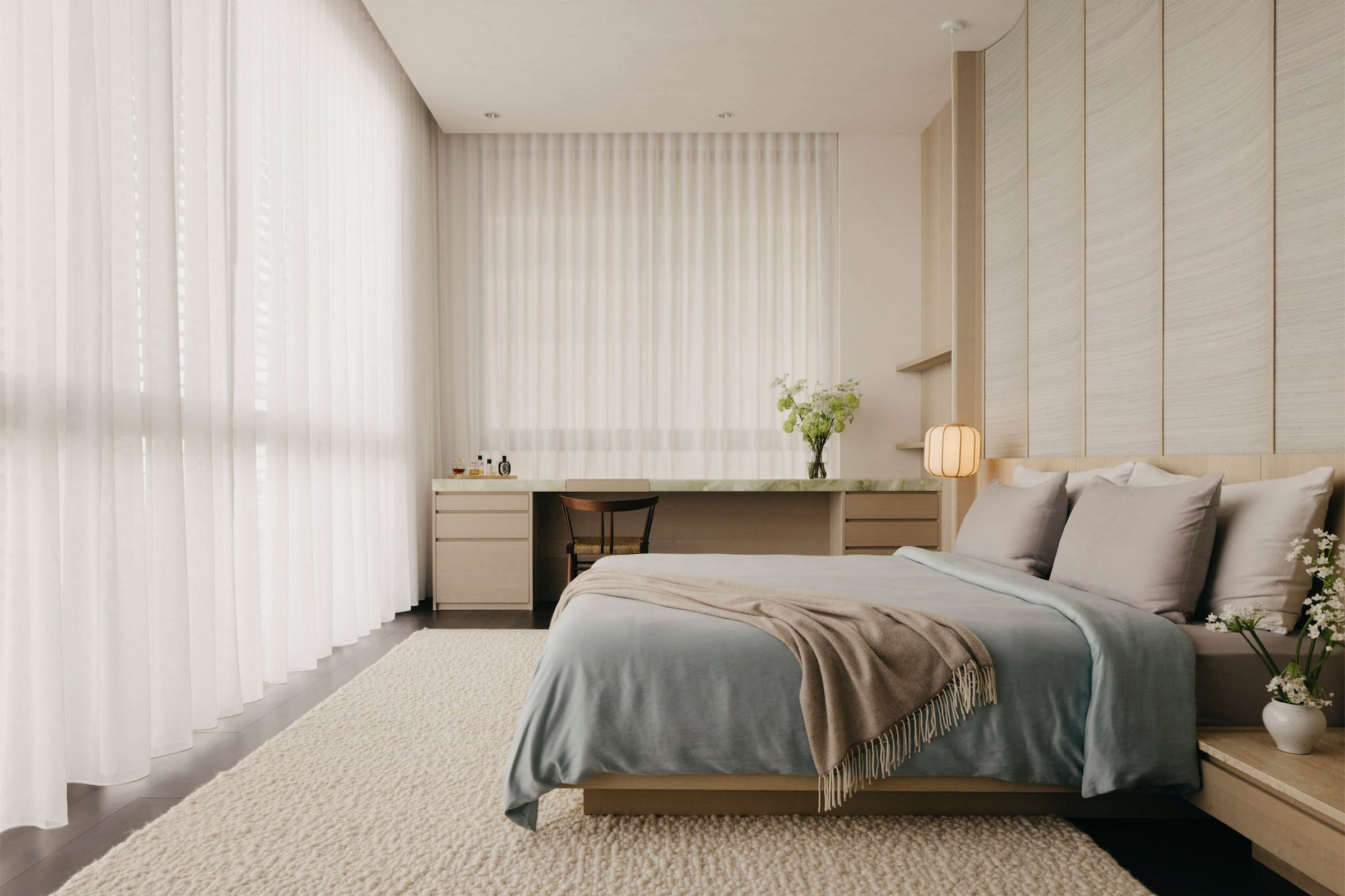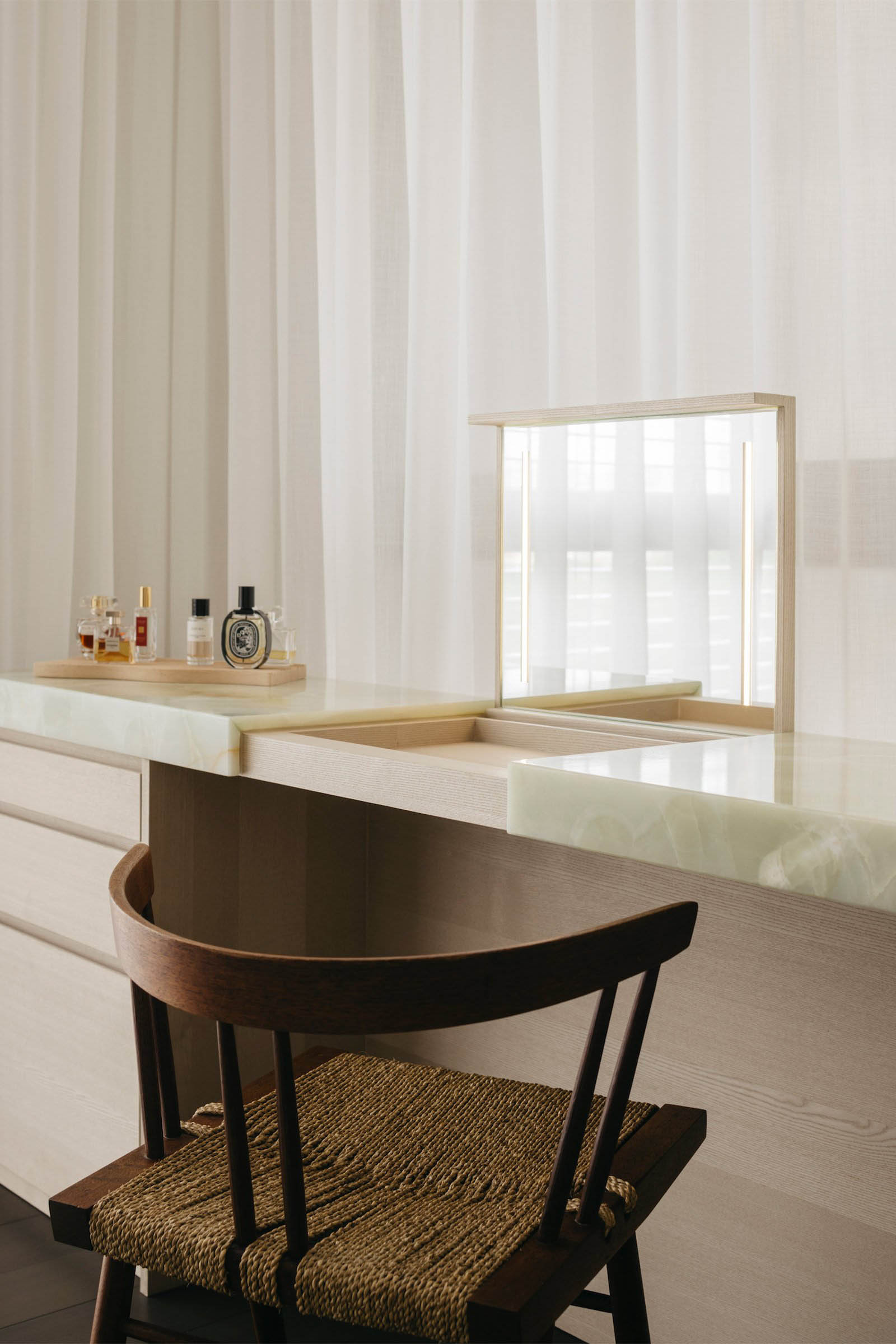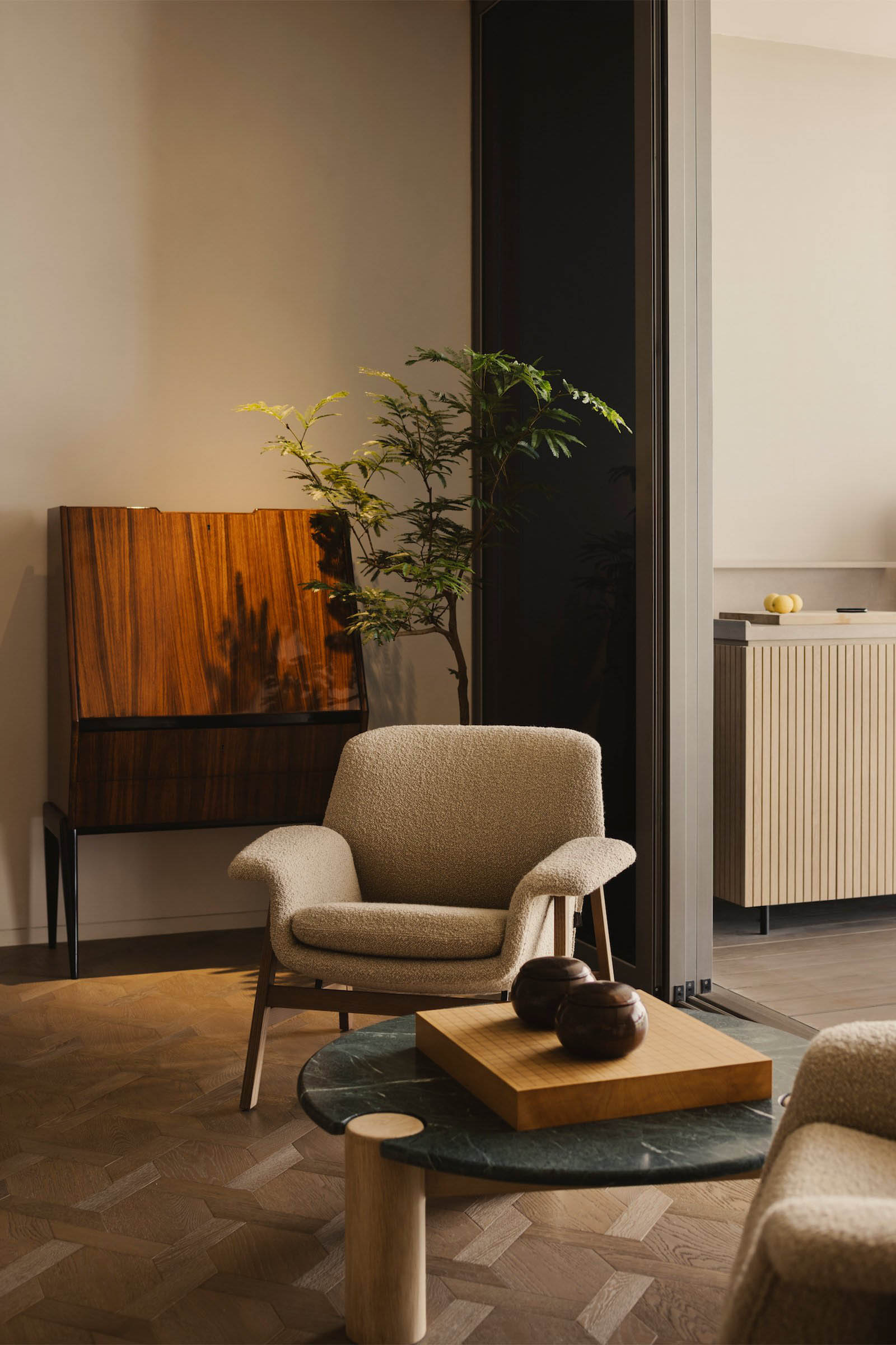 新加坡Takenouchi Webb工作室,由马克·韦伯(Marc Webb)与竹内直子(Naoko Takenouchi)夫妇共营,以精湛材料运用见长,本次案例为他们的家。两人钟情于各自爱好,马克爱潜水与制披萨,竹内则痴迷烹饪与音乐。其设计中,原始饰面与石灰石膏相映成趣,手工质感显著。拱形与曲线柔化硬边,定制金属架与扇形墙承袭此风。开放式起居用餐区巧妙分隔,家具陈设独具匠心。厨房延伸至起居区,绿色玛瑙柜台集休闲与专业于一体。阳台工作台专为披萨制作设计,配备齐全。品牌家具与灯饰增添家居轻松个性。