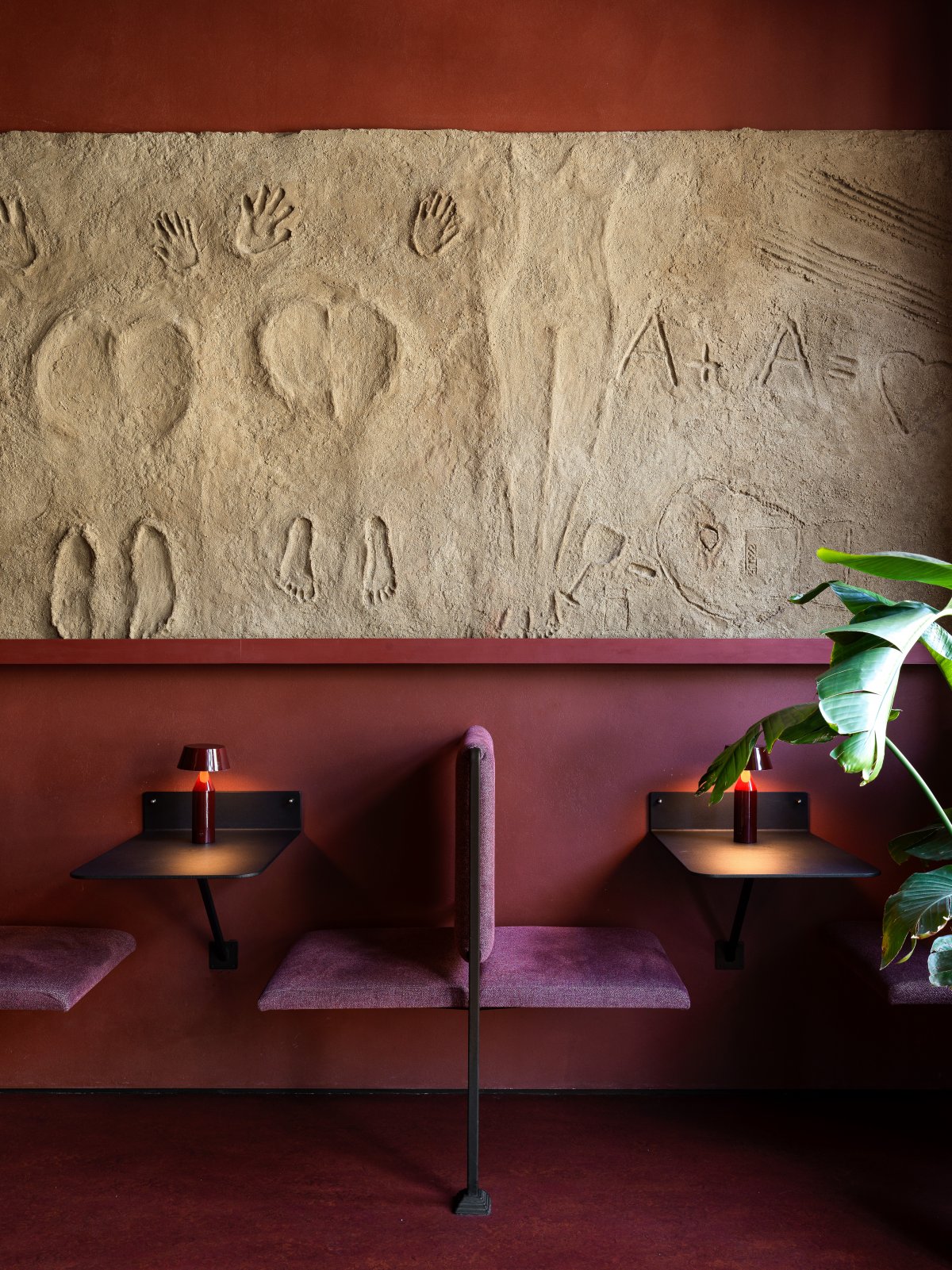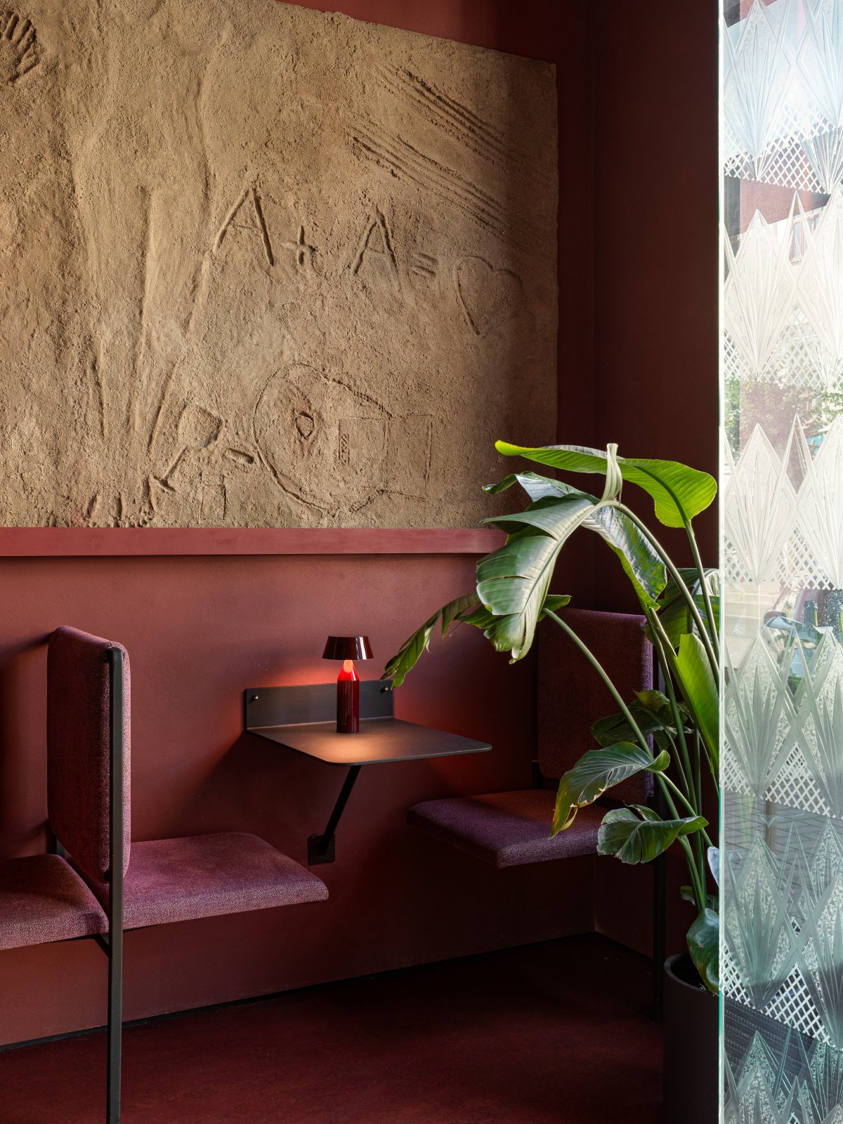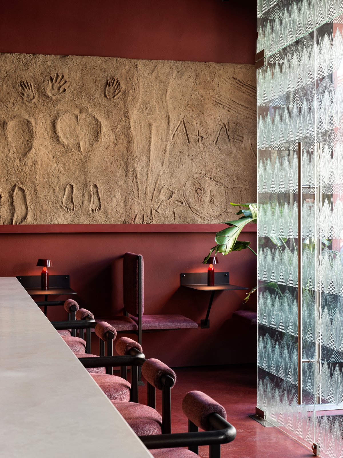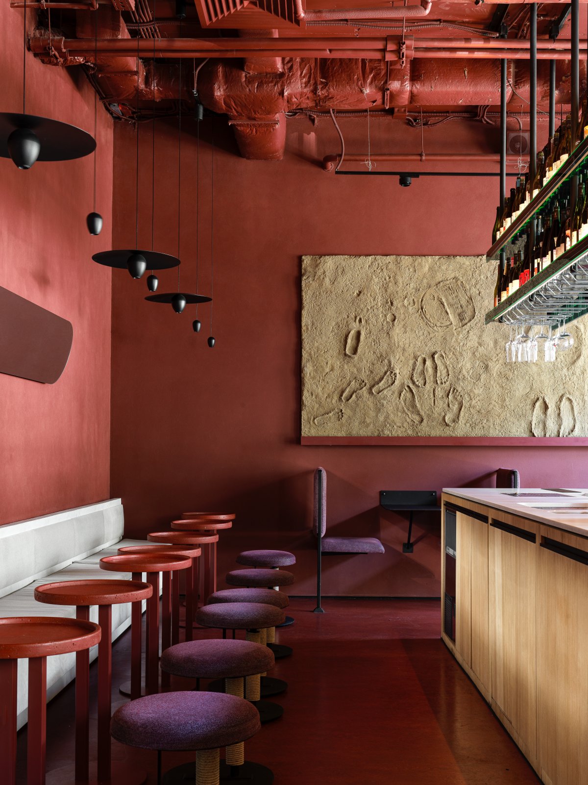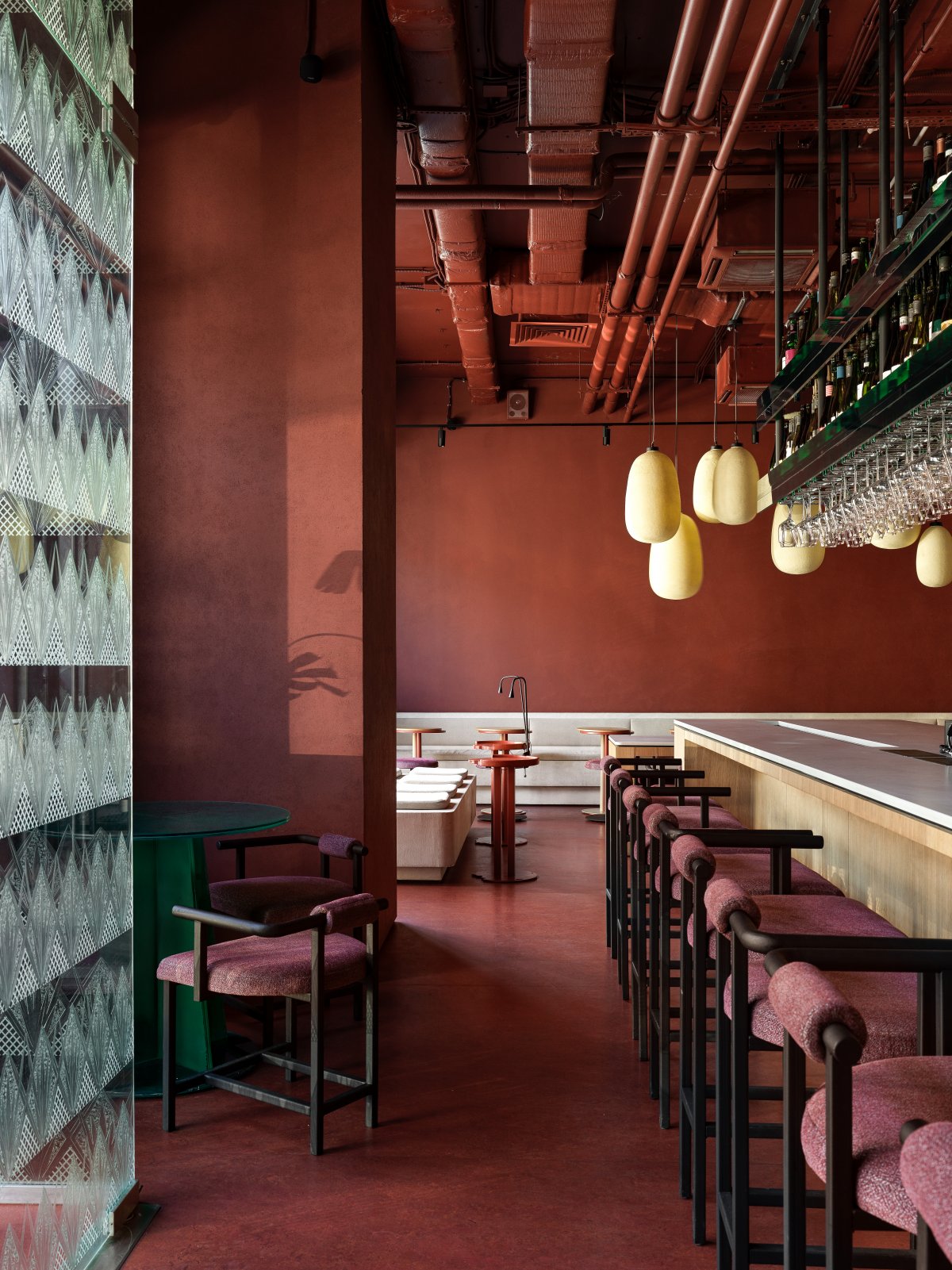 酒吧内部环境巧妙构建,令顾客仿佛沐浴在霞光余晖的恬静之中,整体空间采用葡萄酒基调的丰富色彩,搭配柔和的暖光照明,渲染出宁静舒适的环境。诸如模仿传统酒杯形态的浮雕玻璃装饰及寓意古典酒瓶的多彩玻璃面板等设计细节,无不体现了对酿酒传统的深深敬意,并赋予空间一丝复古韵味与迷人气质。