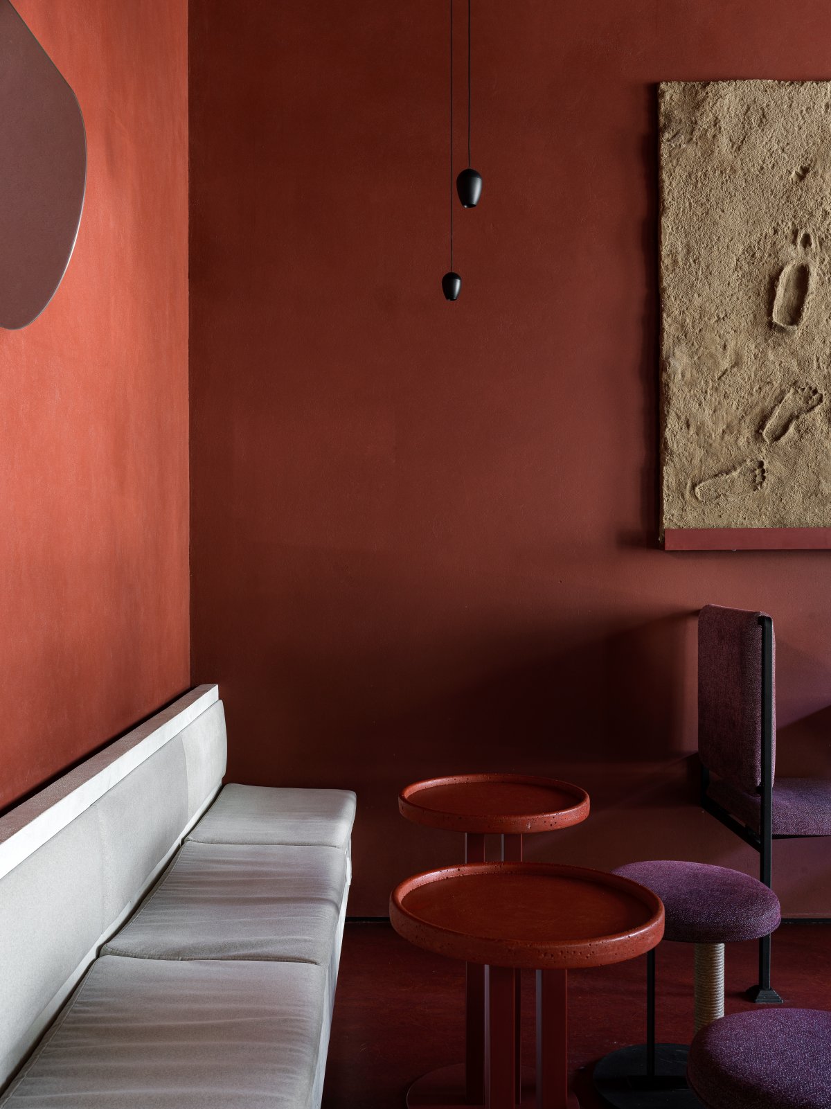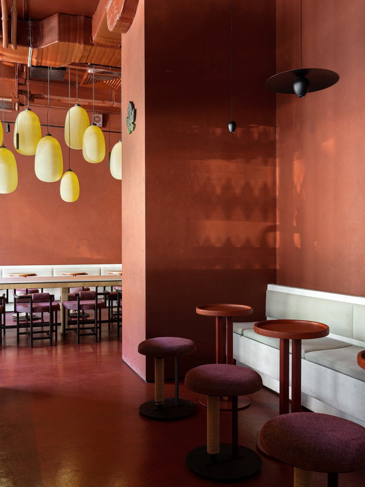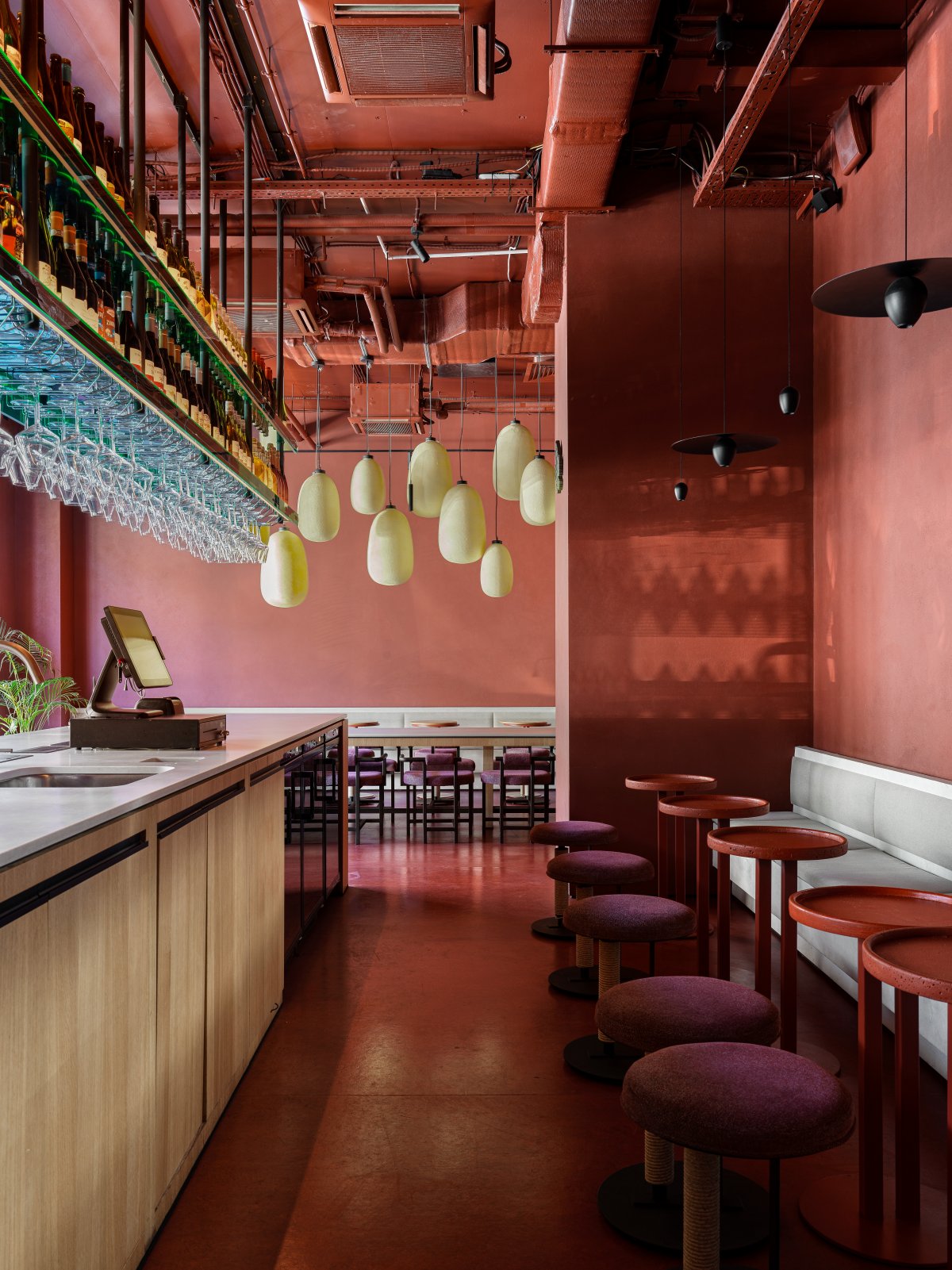 为适应不同顾客的需求,“For a Glass”配置了多元化的座位布局,包括公共长桌、慵懒沙发、私人就餐区域以及吧台坐席,旨在促进社交交流与个人休憩。此外,别具匠心的照明设计如定制灯具与RGBW可调光带,构筑了层次丰富的光影效果,随着日夜更迭变幻出动态情景照明,赋予酒吧鲜活的生命力。