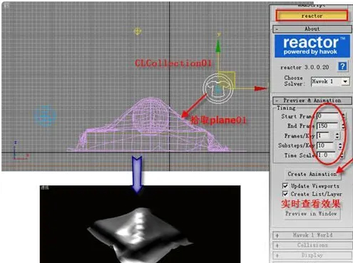 点击“工具”命令面板,点击“reactor”按钮,在它的“preview & animation”卷展栏中,点击“create animation”按钮,生成丝绸由上往下飘落动画。