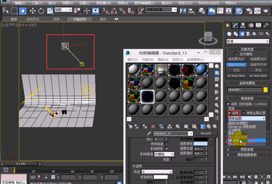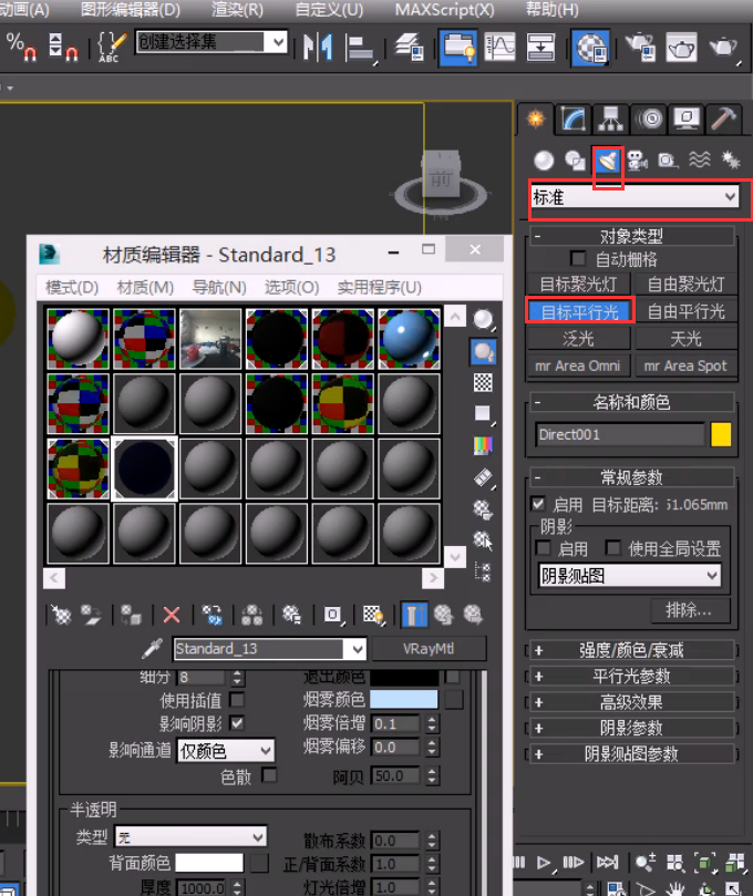 如果用 3Dmax 自带标准灯光、光度学灯光,必须在阴影设置里选择VRay阴影,否则光线穿不过去。以标准灯光为例,通常会用目标平行光或者是目标聚光灯等来模拟太阳光和一些灯光。