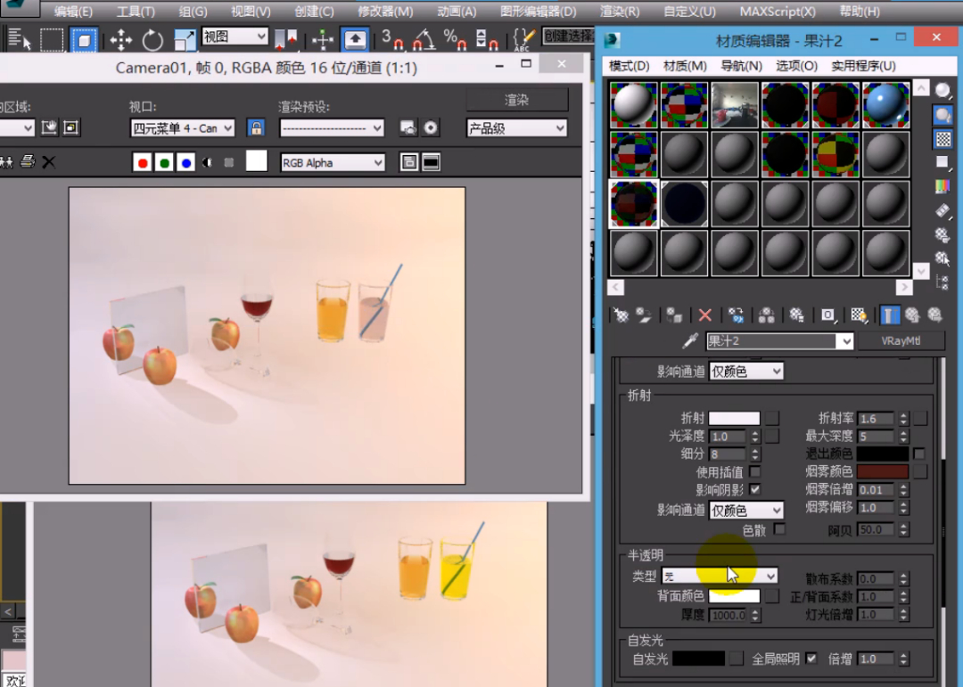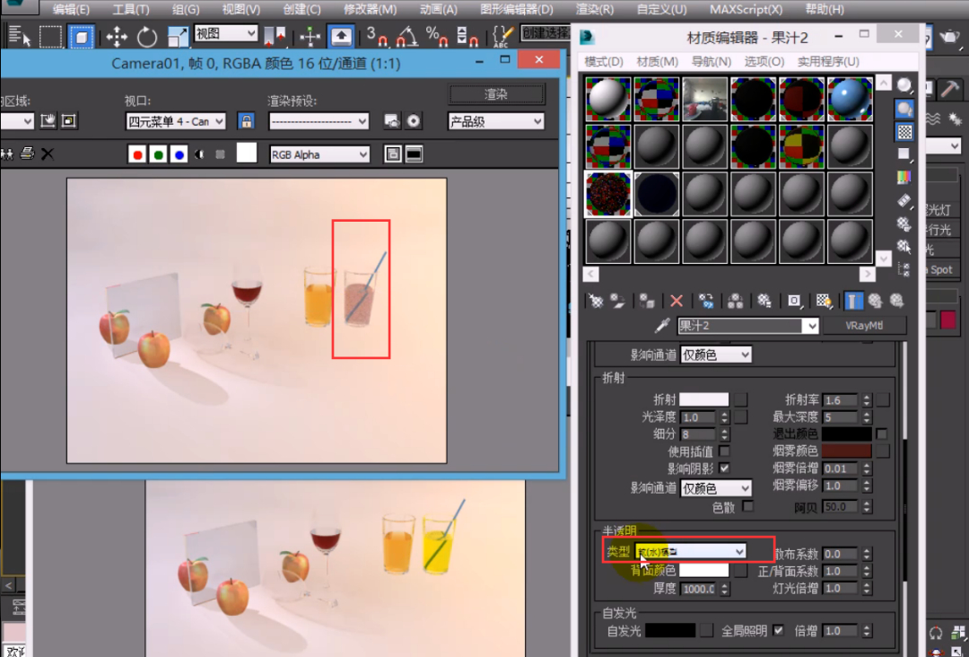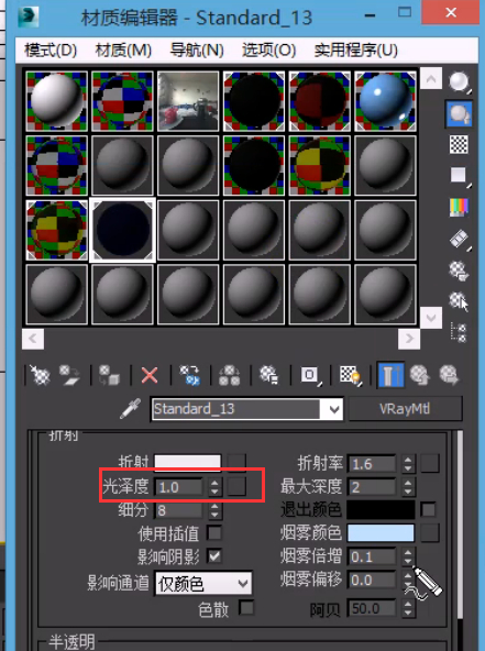 半透明是建立在折射基础上的。如果折射值为 0,就不会有半透明效果,需要先给一定的折射强度,并适当调整光泽度(一般在 0~1 之间)。