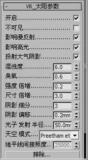 越接近一个黄昏的效果,然后臭氧设置为0.6,强度倍增为0.2,用来控制阴影,细分可以暂时设置为3,在最终渲染时可以将数值增大一些。比如说设置为20左右就可以了。这样一盏VR太阳就设置完成了。