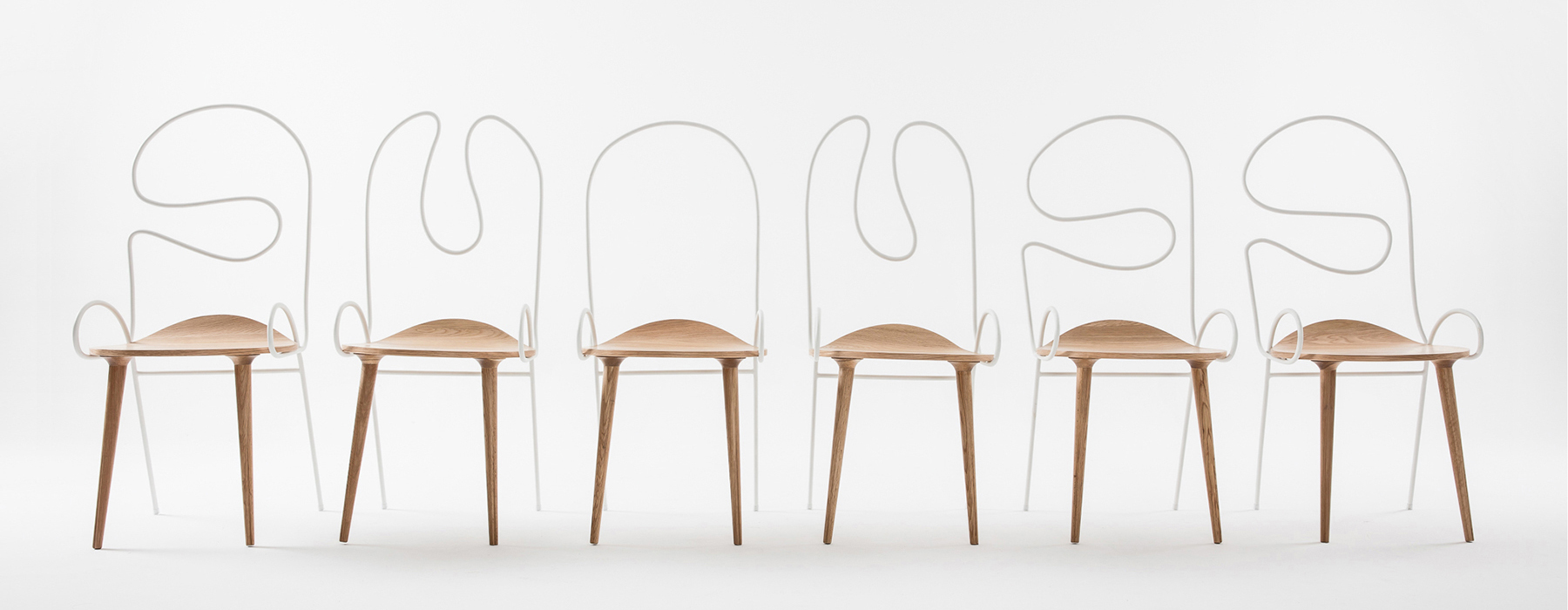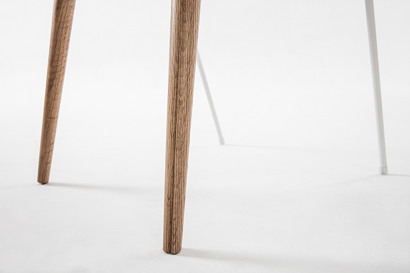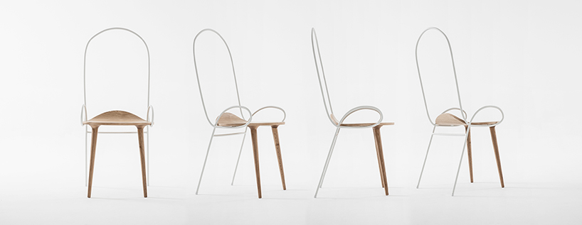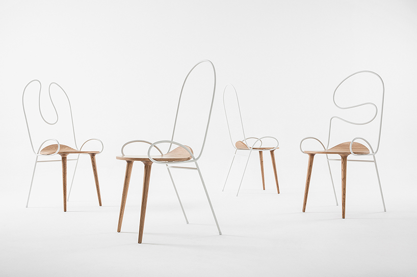 钢管的细长有助于实现座椅的美观和形变,同时,钢管本身形成的各种弯曲图案也实现了支撑不同就座者后背的可能。略微上翘的圆形座板和两条底端极其细长的前腿设计是大舍建筑工作室在“sylph chair座椅”创作上值得仔细研读和推敲的细节之处。前腿上端特意进行了些许的扩张设计,以便更好地承托基板,而椅腿下方则逐渐纤细,创作出一个从圆形到心形的形变部分,模仿女性臀部的轮廓进行设计。这种形态有利于形成更好的抓地力,与后面两条椅腿一起实现了椅子的舒适性和稳定性。