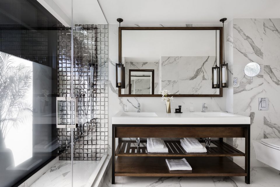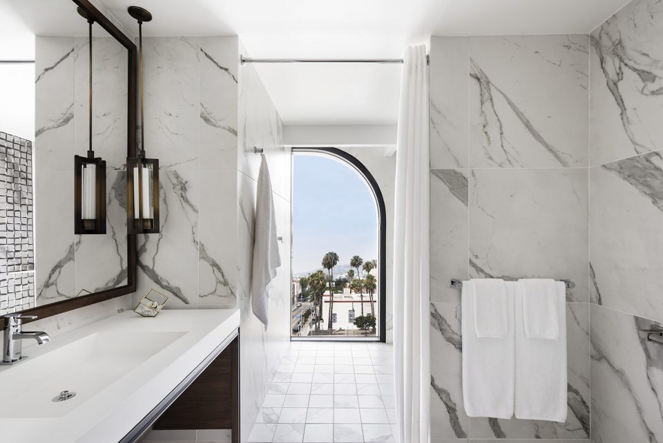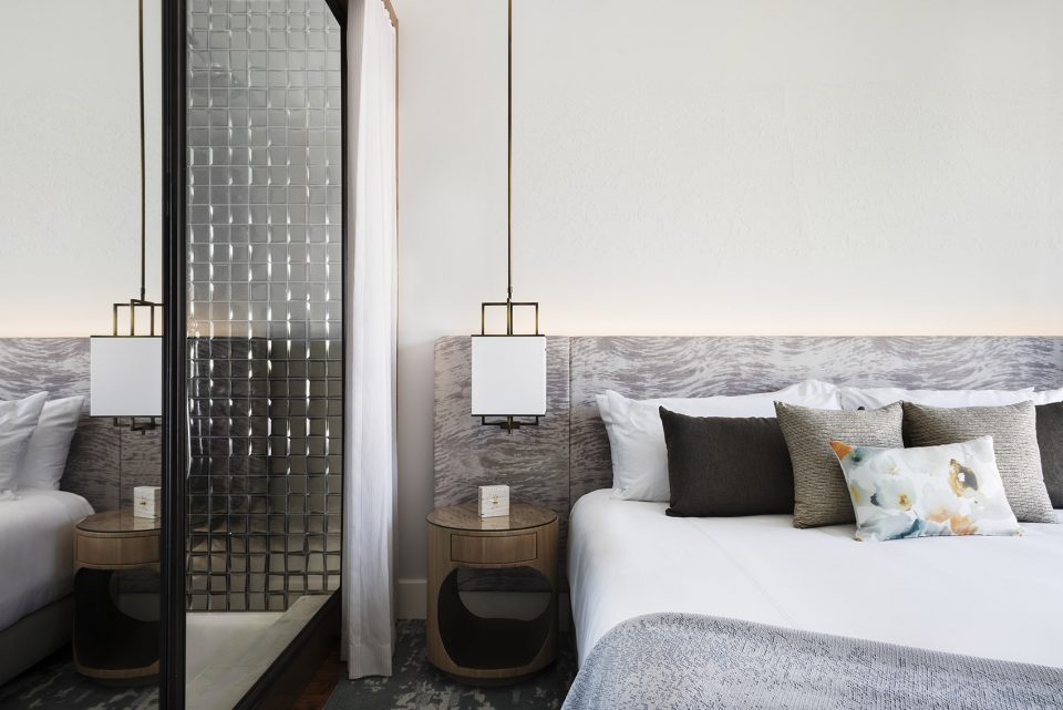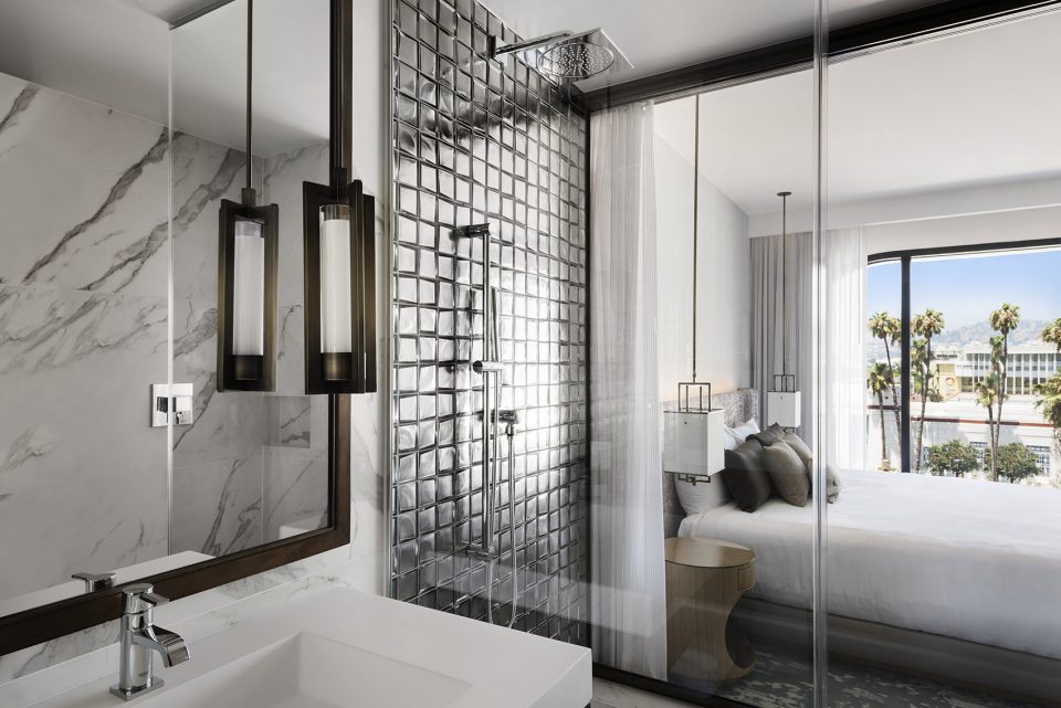 高级客房设计传递了现代的开放感。古色古香的青铜架子定义了空间划分,其内设有洗手池、镜子和迷你酒吧等。床头板上覆盖着定制墙纸,以抽象的方式描绘了洛杉矶景色,如夜晚的高速路。浴室的墙面和过道覆盖着以夸张的镶木方式铺设的两英尺见方的回收木砖。