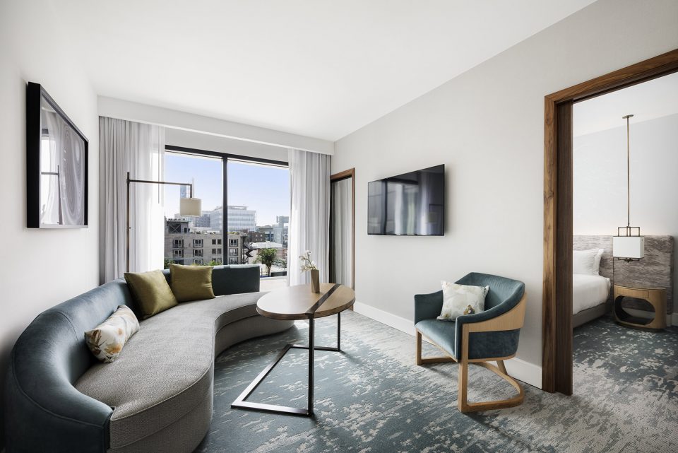 豪华套房的灵感源自简洁的二十世纪中期建筑,被打造为宽敞的明亮城市休闲空间。通过一个旋转木门进入套房,首先将看到一个雕塑。它位于地面和落地窗之间,将视线引导至窗外开阔的城市景观。在舒适的起居室,可以享用美食和惬意时光。起居室还可以变成私人放映室,它与一个露台相连。四面墙上镶嵌有定制灯具,在夜晚将房间照亮。