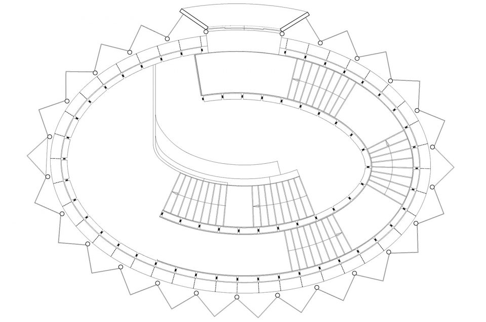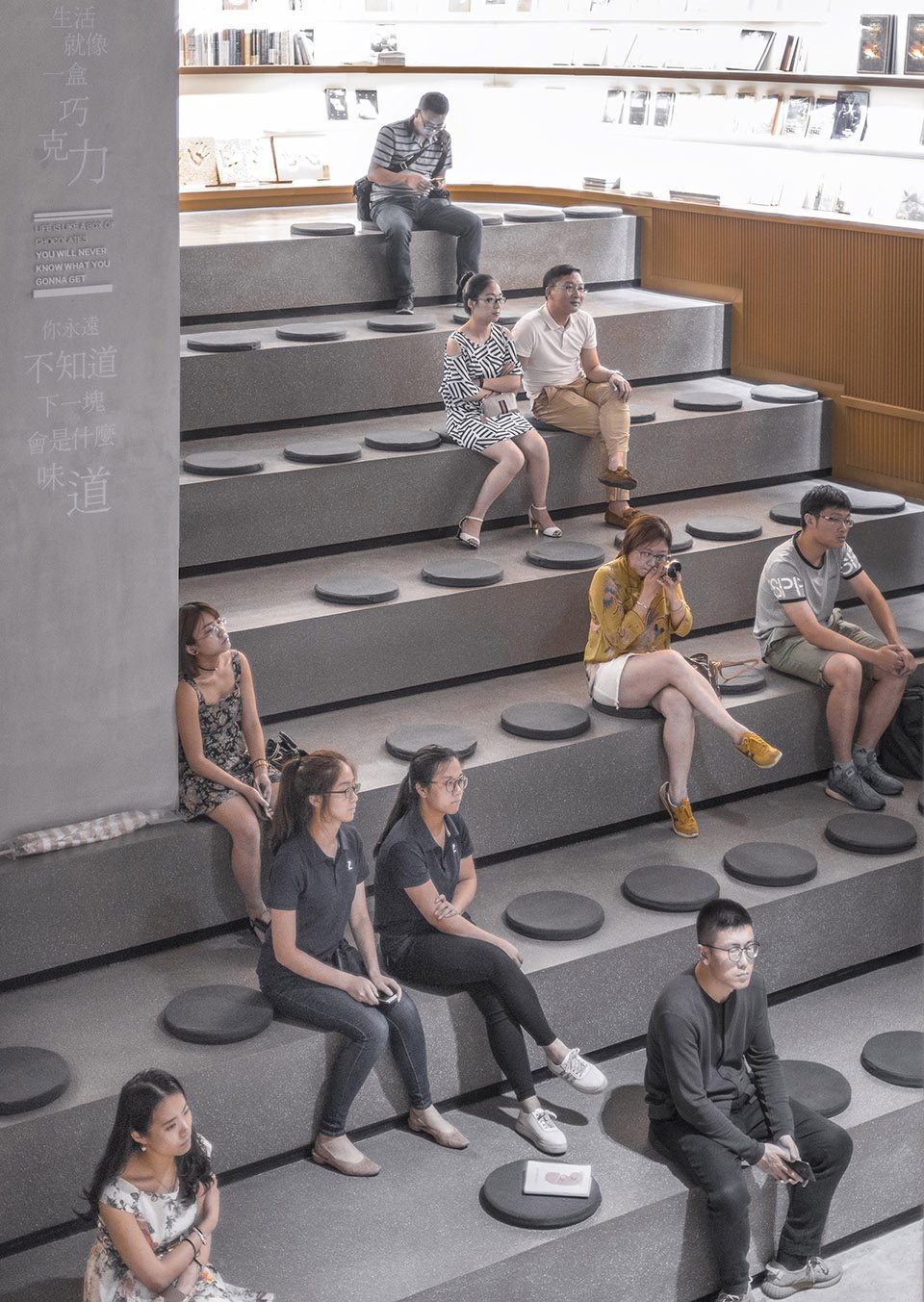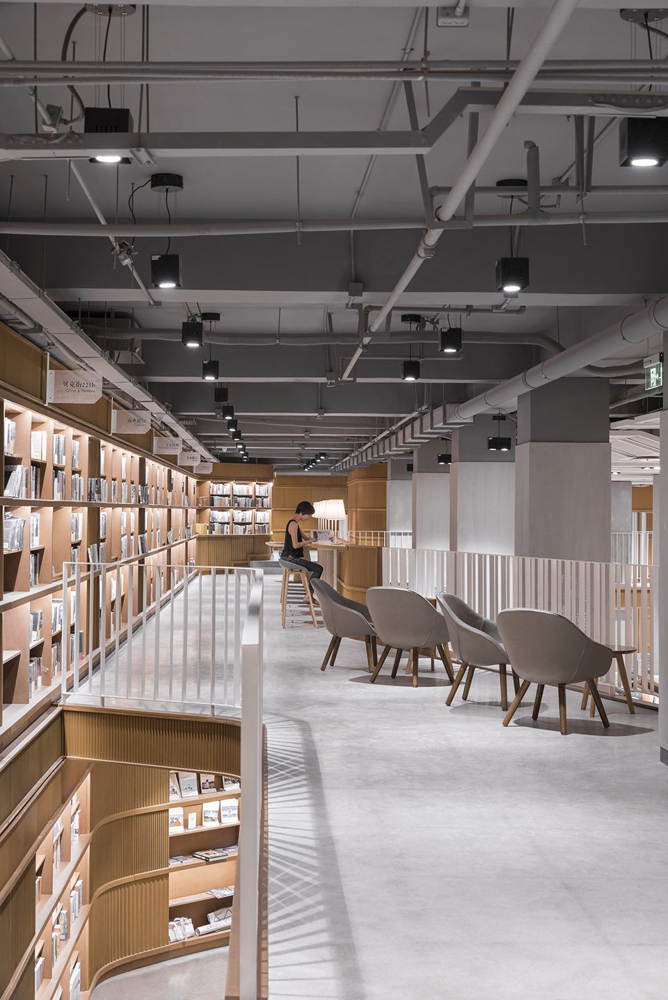 一些较为紧凑和密闭的、服务于特殊功能的空间,如儿童书店和为视听活动准备的多功能空间等,皆被扩展至开放的双层高空间,如书店的中轴,以及用于家庭活动的图书岛。交通空间穿插着一些驻足区域,可供顾客为其喜欢的书本稍事停留,或用于进行一些集体性的活动。