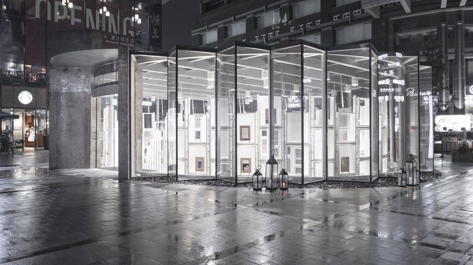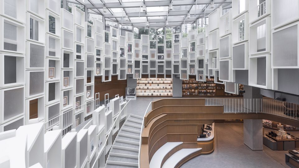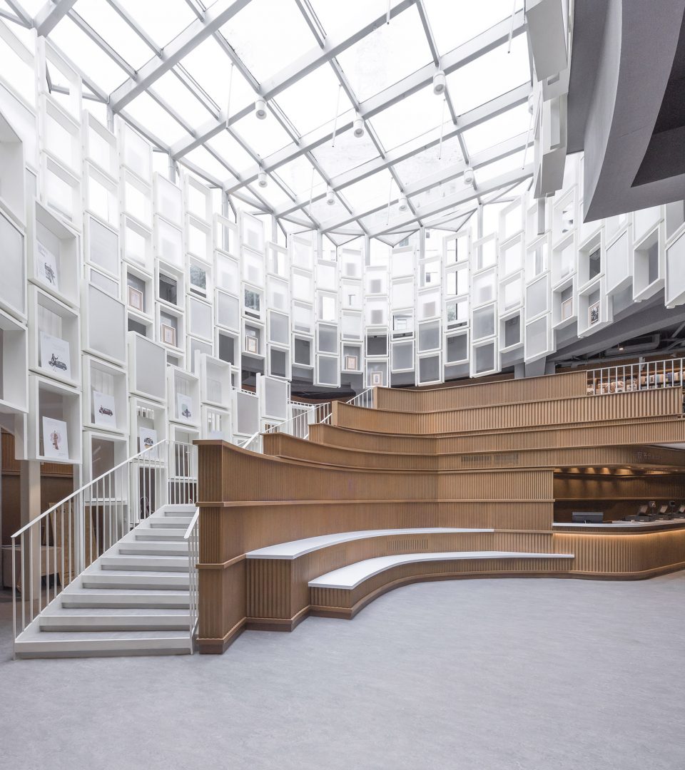 穿过以石材铺设的广场中央的玻璃廊亭,便来到位于首层的主入口。巨大的悬挂式楼梯宛如盘旋的书架,将入口与夹层以及下方的主楼层连接在一起。白天,自然光从这座玻璃廊亭倾泻于书店内部,半透明的亚克力板在滤过阳光的同时,与白色的书架模块融为一体。夜晚,室内的人造光反过来将玻璃廊亭点亮,使其成为书店中闪闪发亮的陈列柜,同时也可用于各种各样的活动。