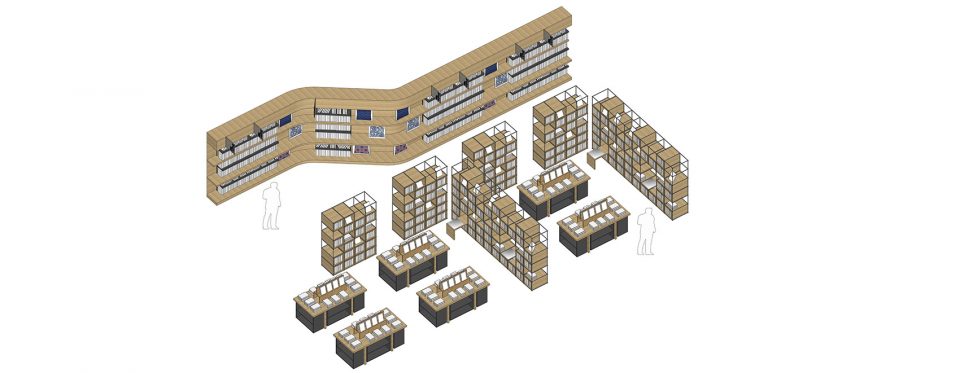 与墙壁上的书架相对应,同时受到1960年代Michelangelo Pistoletto在瓦楞纸板中发现的“迷宫”的启发,设计师在书店中设置了相似的由透明独立书架和柜台构成的模块系统,从视觉上将空间划分为一些更小的“房间”和“小窝”,同时带来额外的就座和阅读机会,以及更多样的书本陈列形式。流动而有机的几何形态、柔软的材料和纹理,以及温暖的色调,象征着历史上不同的纸张和材料,从而巧妙地呼应了书本的内涵与实质。
