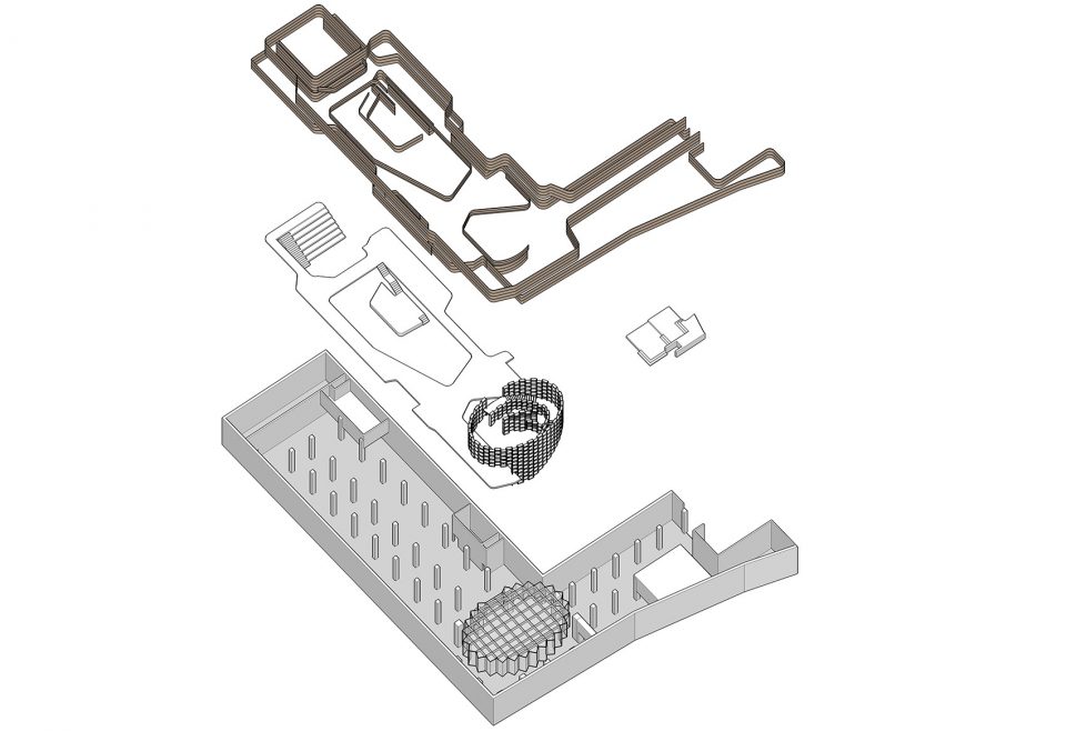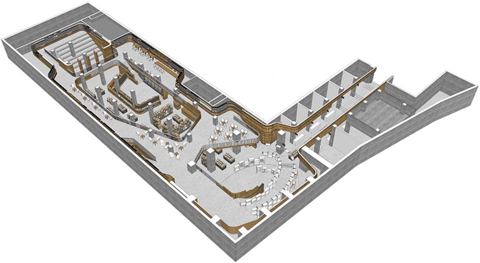 书店位于宁波市中心、余姚江南岸的和义路1844艺术生活中心广场,占据了一块L形的全地下场地。功能空间分布于现有的B2层(1600㎡)和新增的B1夹层(800㎡),总建筑面积接近2400㎡,整体分为三个不同的主要区域:书店主体、以新技术和饮食为主题的区域,以及位于二者之间的一个灵活的公共空间原创3d模型下 载。