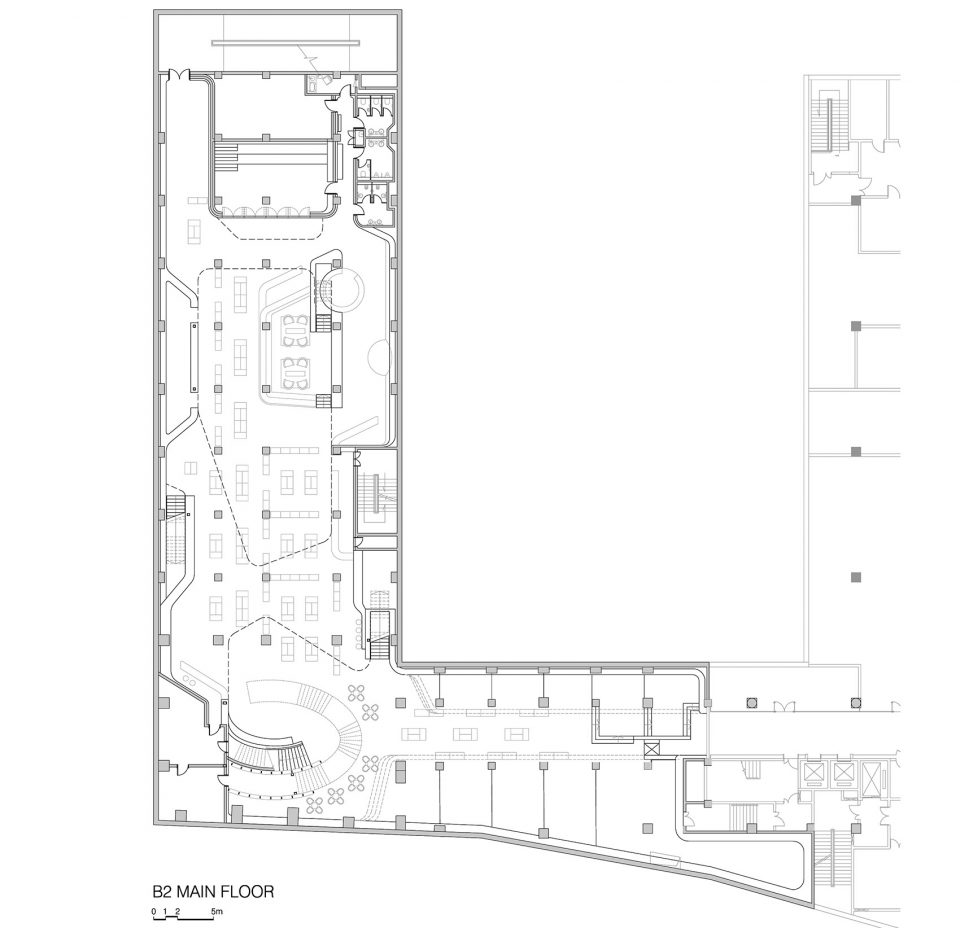 楼梯首先到达就座区和阅读区所在的夹层,继而进入主要的地下楼层。4座楼梯为这两处空间提供了额外的纵向连接。环顾四周,墙壁上排列着通高的书架,犹如一条在整体空间中不间断循环的缎带,将不同的功能空间彼此区分或联系起来,引导顾客完成一场充满变化的书店之旅。建筑中除双层高的小型中庭、活动空间和儿童区外,还包含一间茶室、果汁吧、咖啡厅以及面包店。鉴于其中一些区域将由第三方雇主独立租用,因此项目的设计需要在保证使用的灵活性以及适应各种功能和品牌特性的能力的同时,使建筑整体巧妙地保持连贯和统一。