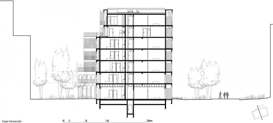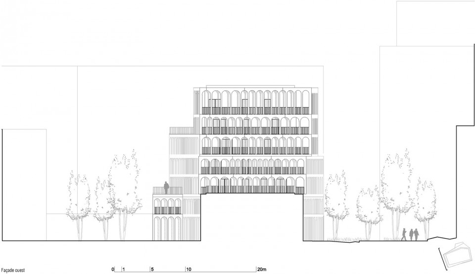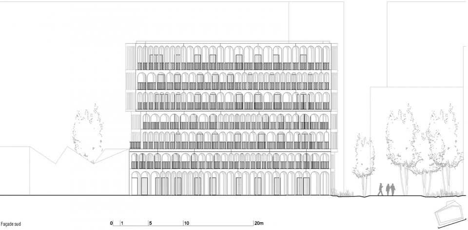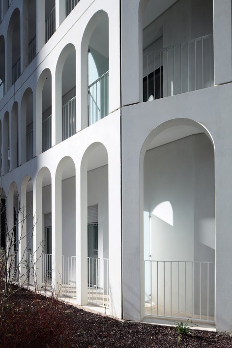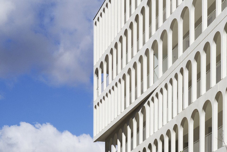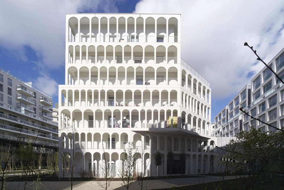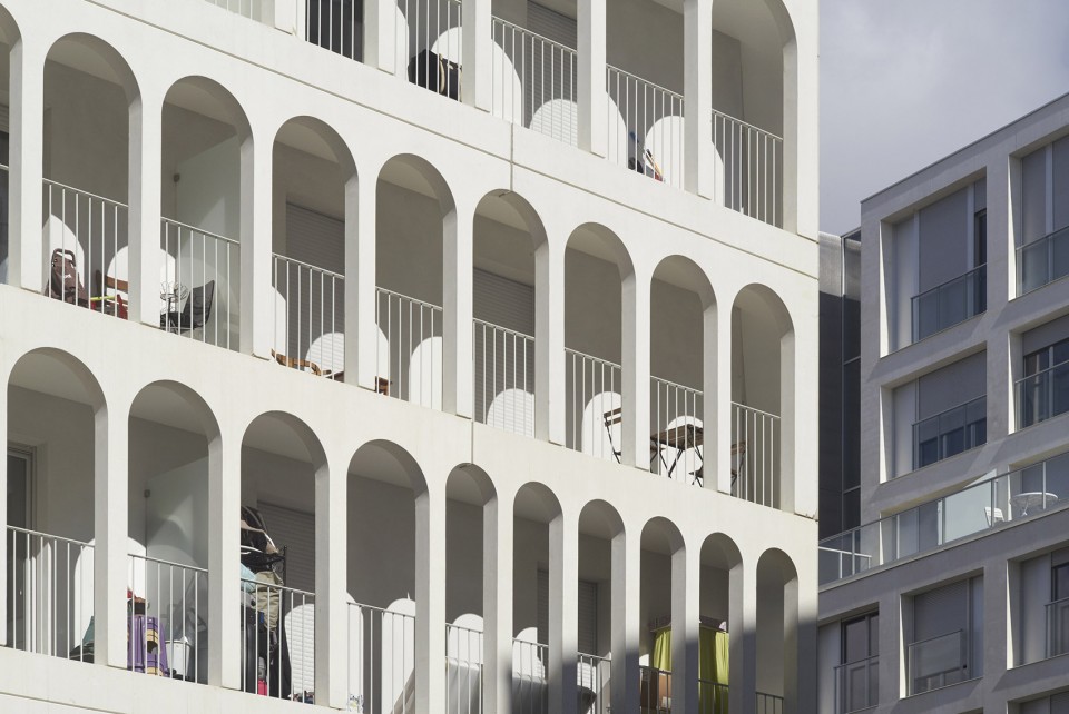 拱形柱廊是建筑师对雷诺工厂传统建筑元素的重新演绎,宽窄不一的间距则为建筑立面添上了丰富的变化。环绕建筑的廊下空间服务于居民,每家每户都拥有一个长长的阳台,或成为储物空间、或成为休息露台,随居住者的需要发挥着不同的功能。