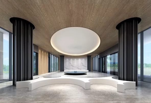 轻盈的纸卷形态支柱,给空间增加了稳重的节奏感,也聪明的勾勒出洽谈处的半私密空间,仰头便可感受到柔和的天光从洁净的软膜天窗中撒下,映射大堂内的白色石材流水冲蚀的开槽凹痕,浑然天成,自栩一格。