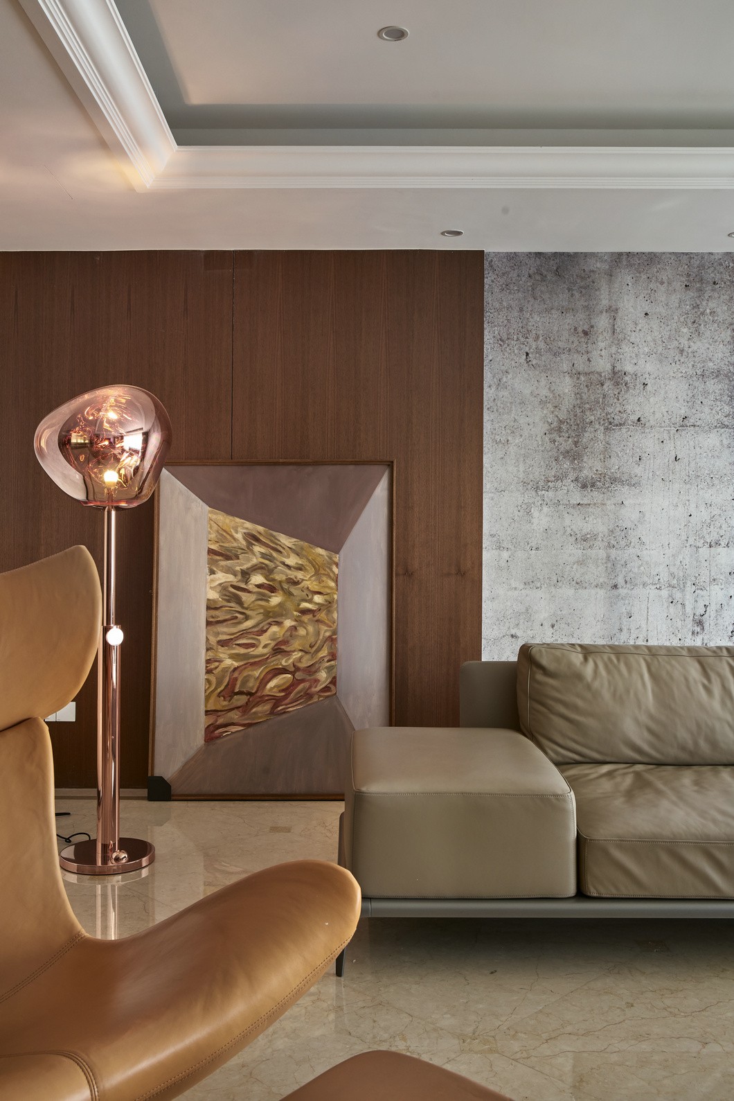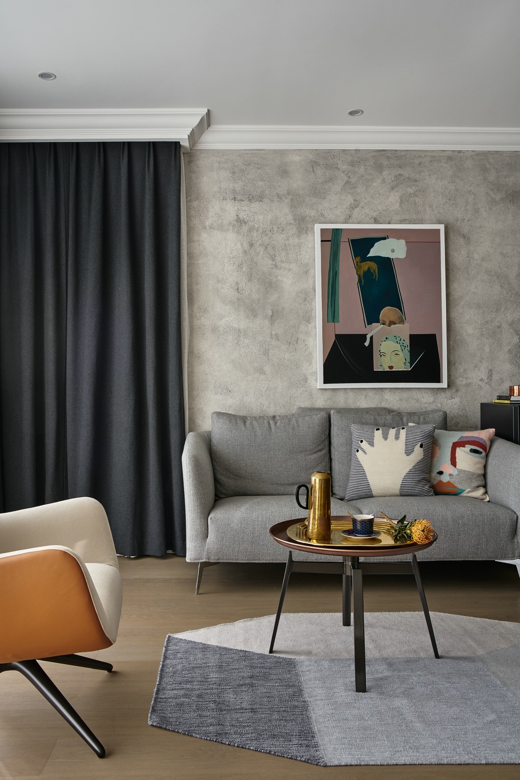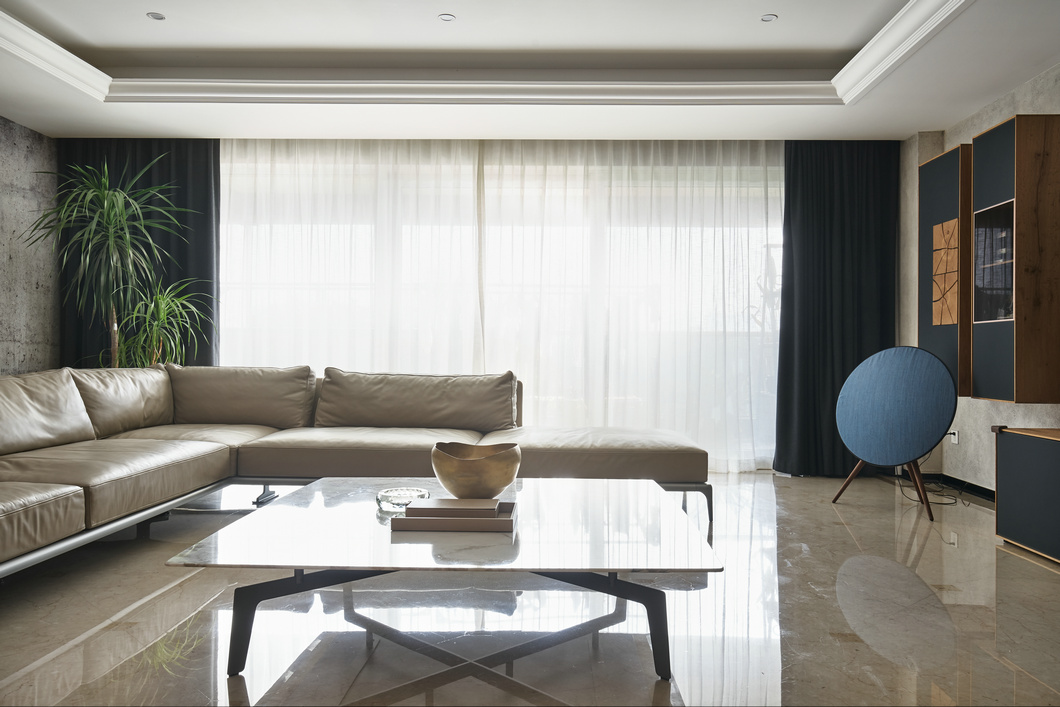 客厅里摆放着意大利高端家具品牌POLIFORM的沙发和茶几--笔直的线条简洁利落,高贵又优雅;茶几上摆放着pinetti 的遥控盒和Tom Dixon果盘。左侧是丹麦时尚品牌BoConcept的单椅;左侧搭配了Aytm极简纯铜金属镀面Curva杂志架;沙发旁边摆放着Tom Dixon 的铜质落地灯。