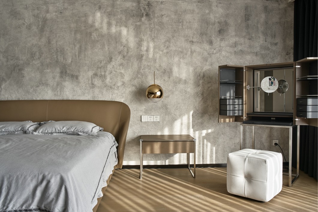 主卧里摆放着德国顶级现代品牌Cor的床、床头柜和化妆柜,灯具均来自于Tom Dixon。