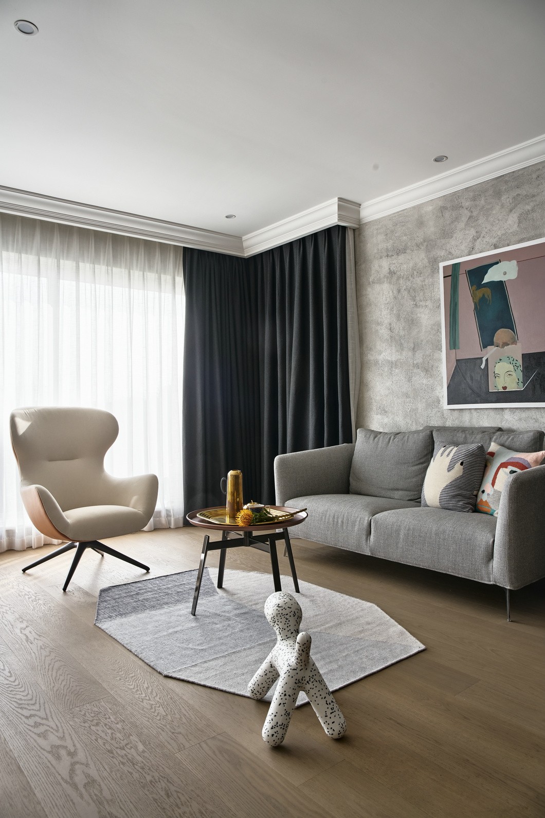 沙发是Schelbach-home,单椅是POLIFORM,茶几是 B&B,茶几上摆放的茶具是Tom Dixon 和 wedgwood 的byzance系列 ,墙上的画作出自美院优秀毕业生刘同学。