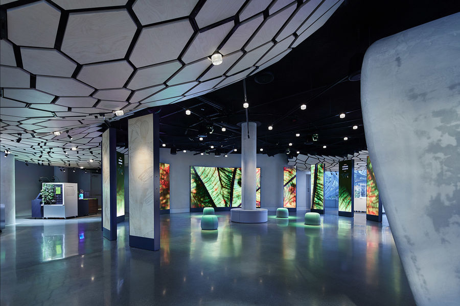 The Spheres的设计充满了传奇性,空间宽阔高大,引人注目,因此本项目的挑战之一就是如何将这些特点呈现出来。因此,Understory展厅的空间极具震撼力:天花板压得很低,一个巨大的管道占据了其大部分面积;在空间的中心位置竖着一根柱子,用以支撑上部空间中最大的一棵树;整个室内空间中的自然采光十分有限。管道系统和设备太过于抢镜,因此建筑师设计了一系列定制的六角形胶合板,有机地重塑了天花板的形态,将管道和设备隐藏了起来。空间内部也需要极高的灵活性,为了达到这一效果,所有的展品或展架下方都装有轮子,当有展览或聚会活动的时候,这些轮子可以确保空间被迅速地完全改变。