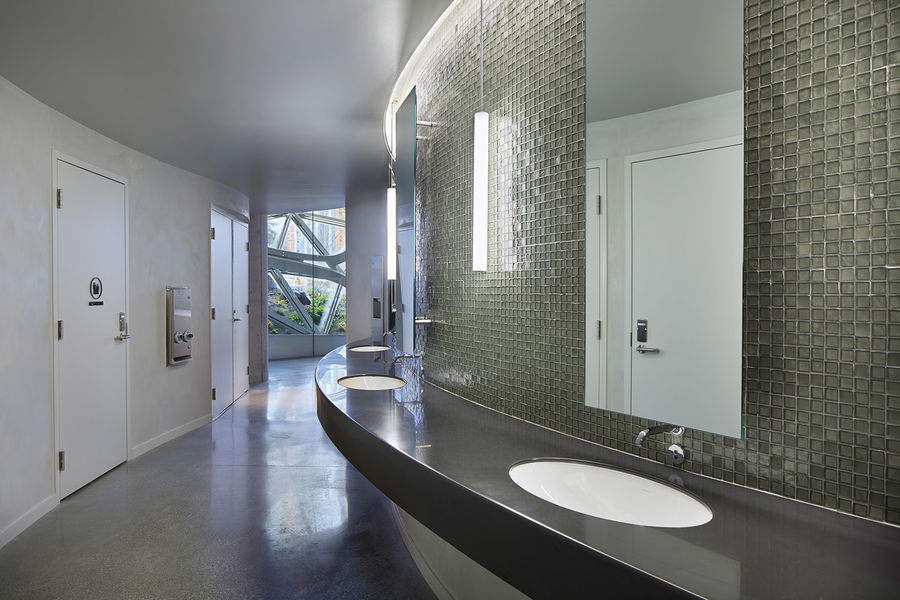 立方体模块组合出不同的形态,用以展示建筑模型、放置三维互动性装置和一个不断更新的小型植物展览。触屏滚动播放着视频,使游客沉浸在植物和建筑的访谈和故事中。模块化单元则深入讨论技术细节。室内共铺设了超过3英里的板下布线,为这个多功能空间和展览提供了设备支持。卫生间位于主曲面投影墙的后方。为了最大程度地减少占地面积,男女皆宜的隔间靠着一侧墙体排列,洗手池靠着另一侧墙体排列,形成一个单流线空间。