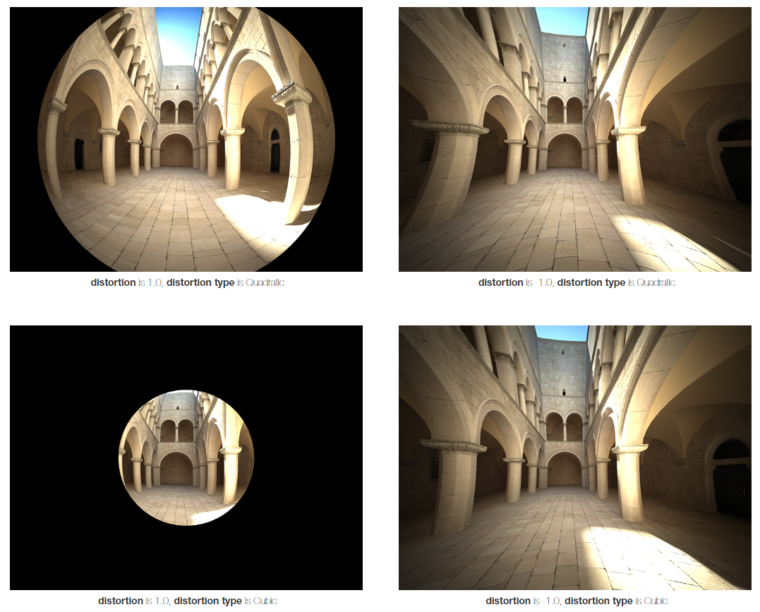 distortion amount – 在选择以Quadratic和Cubic类型时,可以设置扭曲的强度,0表示没有扭曲,正数将产生“外凸形”扭曲,如同一个酒桶,而负数将产生“内凹形”扭曲,如同一个枕头。