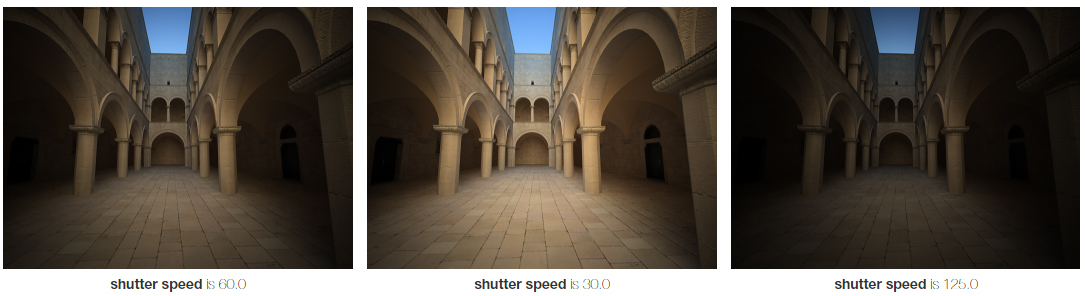 exposure – 当曝光参数被勾选时,f-number, 快门速度和shutter speed, 和胶卷速度(ISO)就会对画面的明度产生影响。