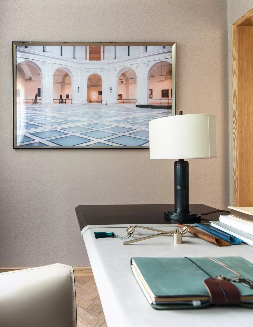 本案以冷色调为主,以黄铜色点亮,复古细节家具物件,整体线条既有犀利的大件,也有柔和的小件装饰,兼收并蓄,打破无聊;在材质管理上,以皮质、黄铜、大理石、天鹅绒和棉等元素强调复古气质,让生活留住逝去的时光。