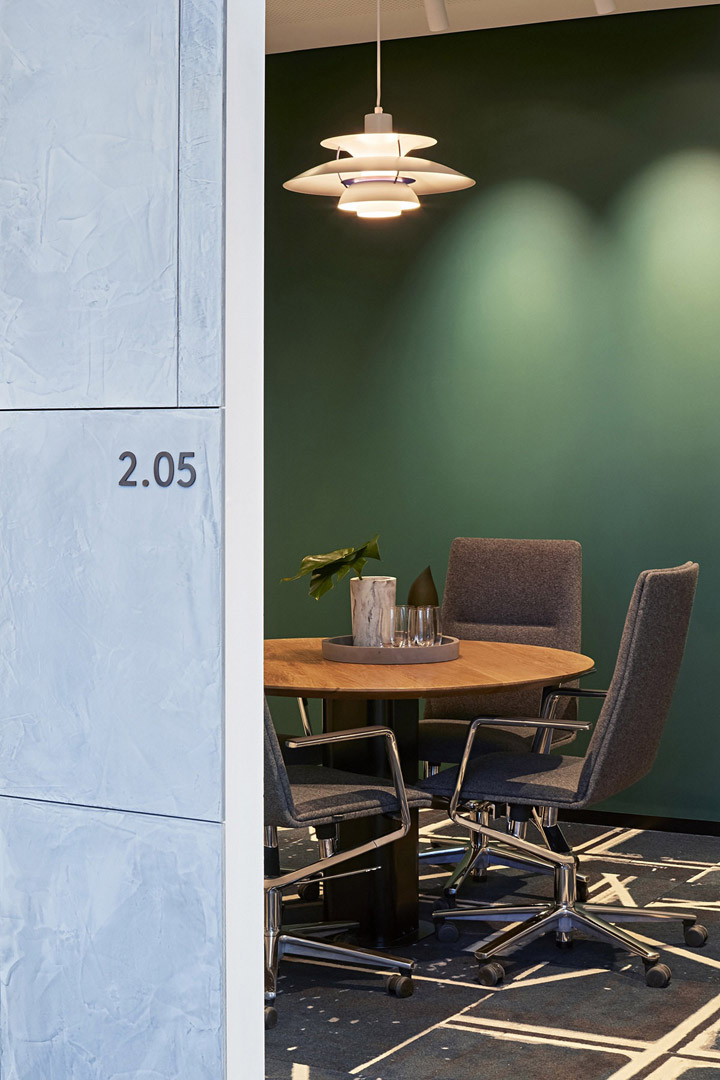 客户大厅点缀着中性色彩的灰褐色和土红色的现代家具,它们即美观又实用。结合嵌入照明的木梁强化了空间的高度。每个楼层的水平动线经由内部的楼梯形成垂直连接。楼梯的战略性布局巧妙地连接起建筑新、旧两个部分。